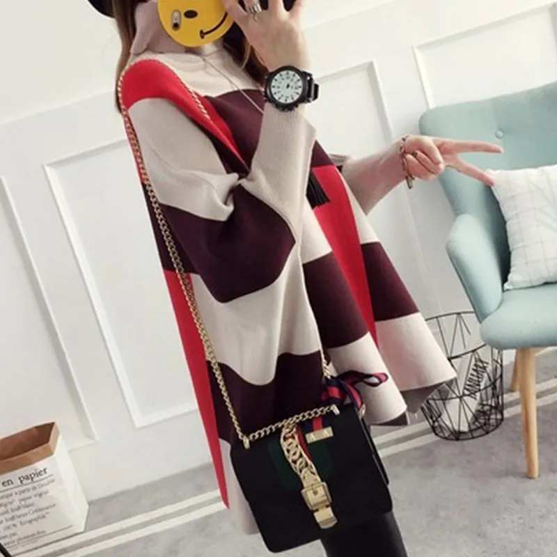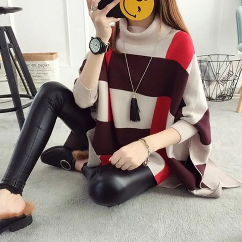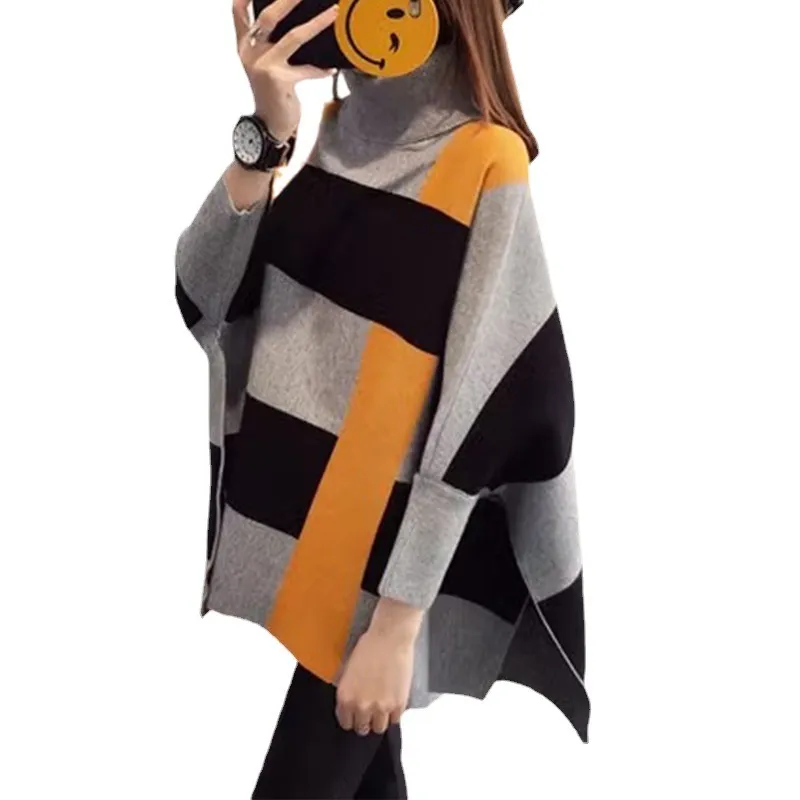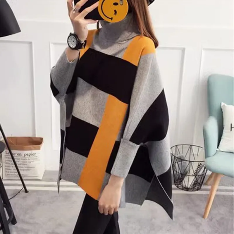 衣都精品- 2023新款格紋寬鬆高領套頭斗篷針織上衣