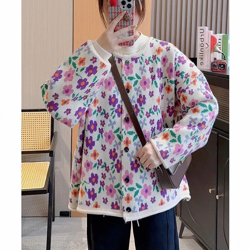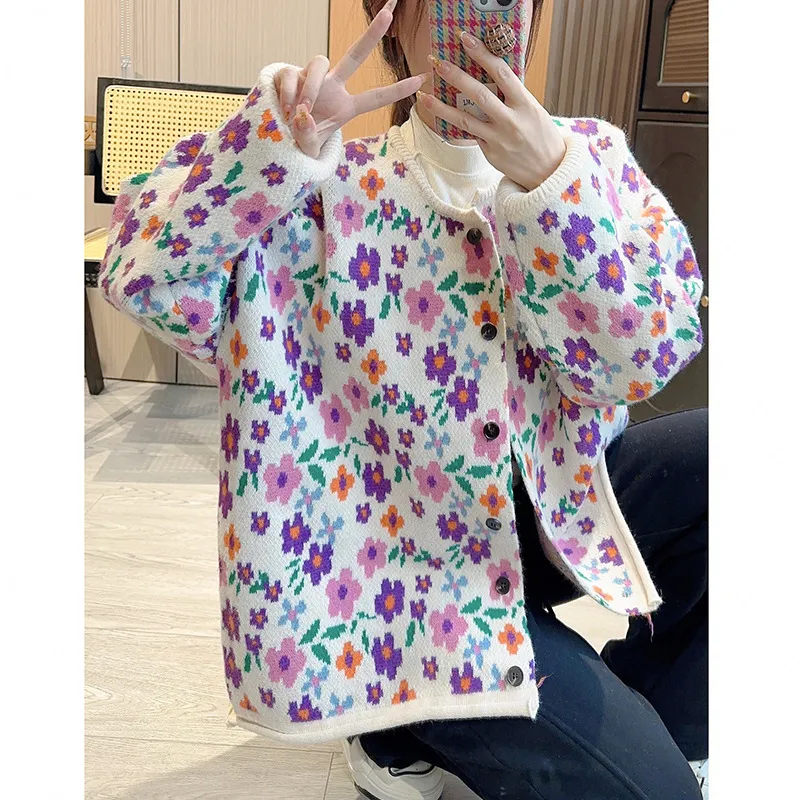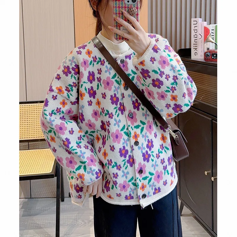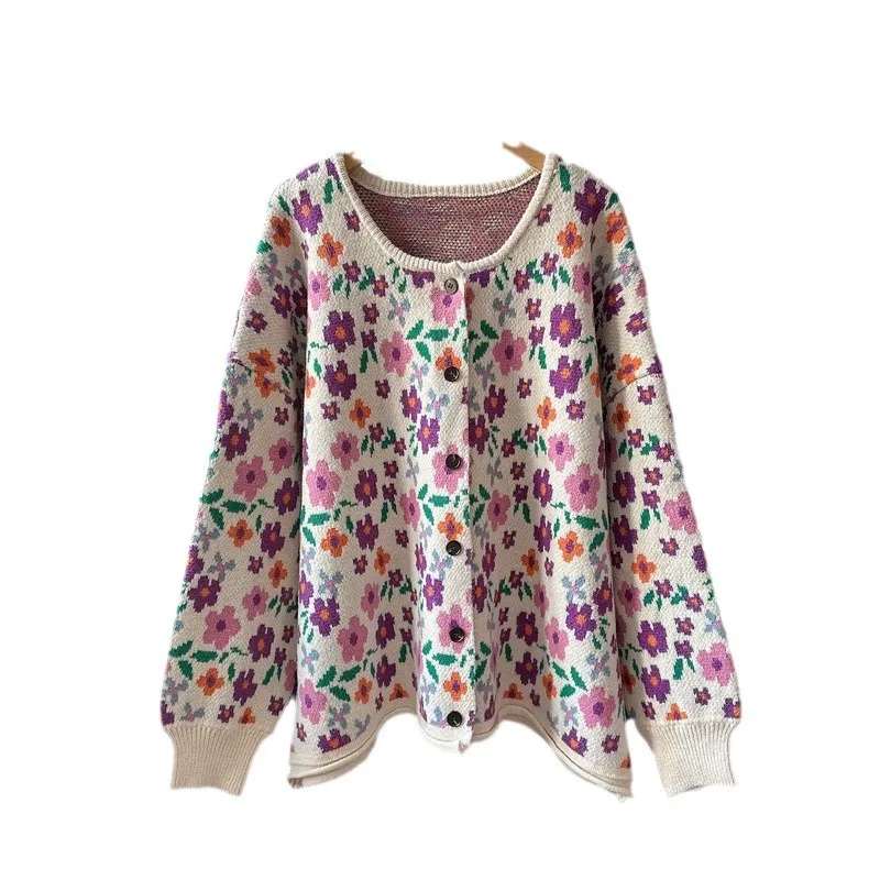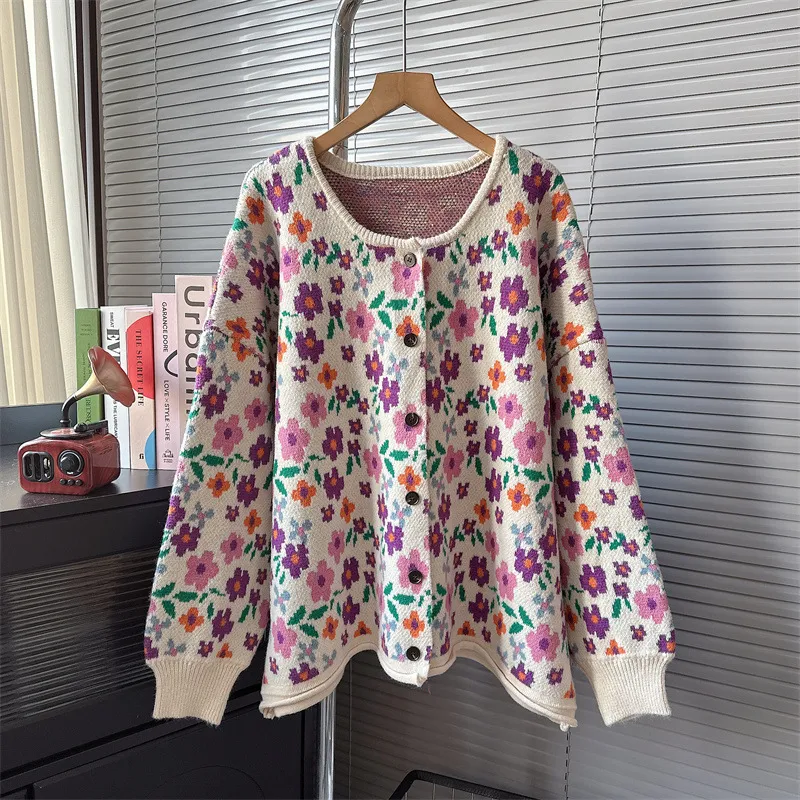 衣都精品- 2023新款復古寬鬆大碼慵懶風花朵針織外套