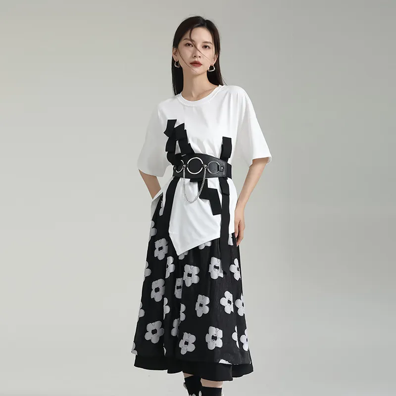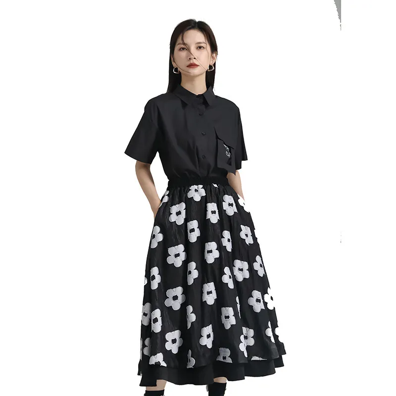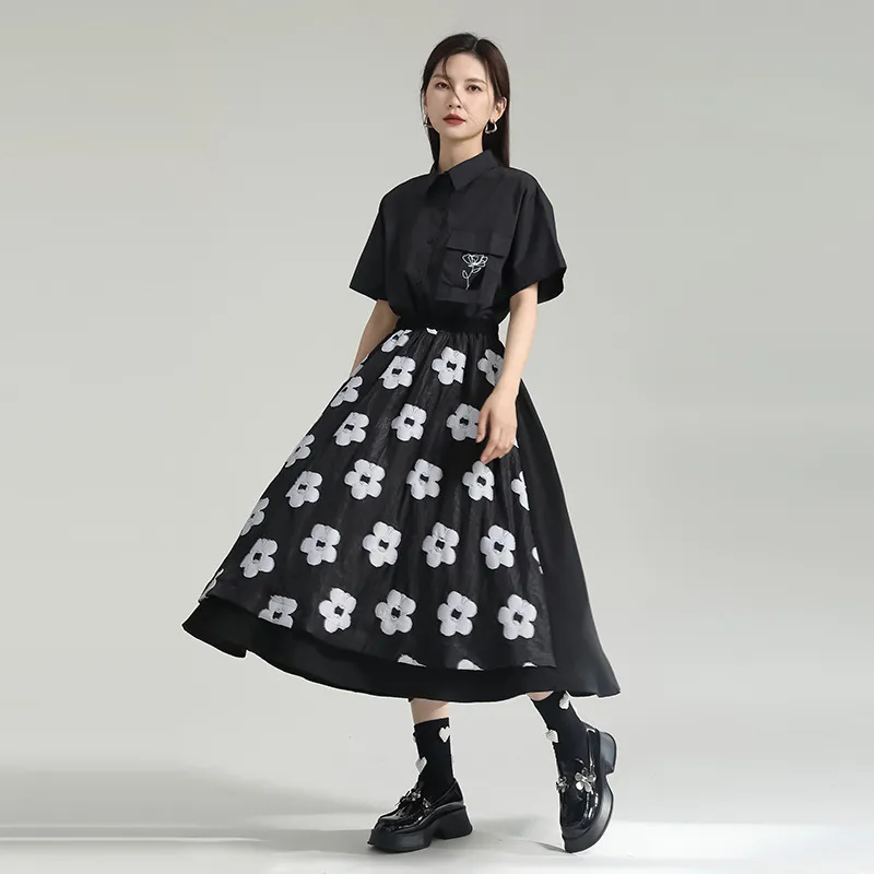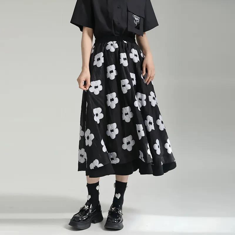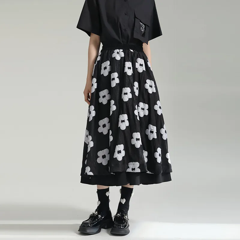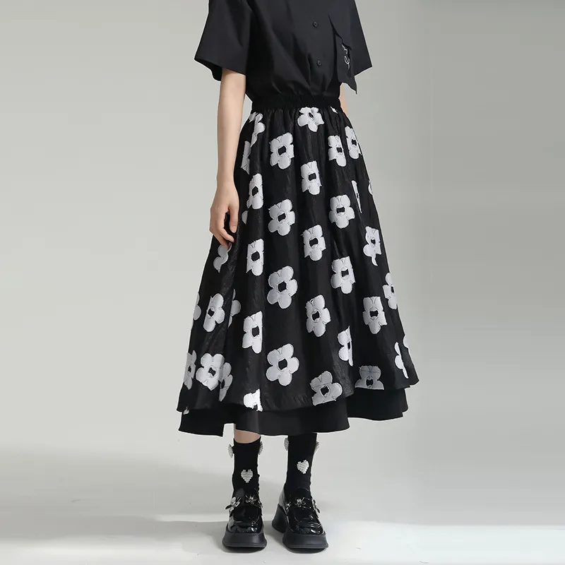 衣都精品- 2023新款暗黑風小眾設計拼接網紗花朵半身裙