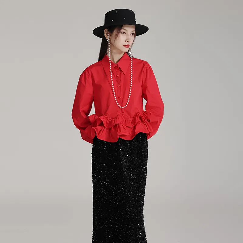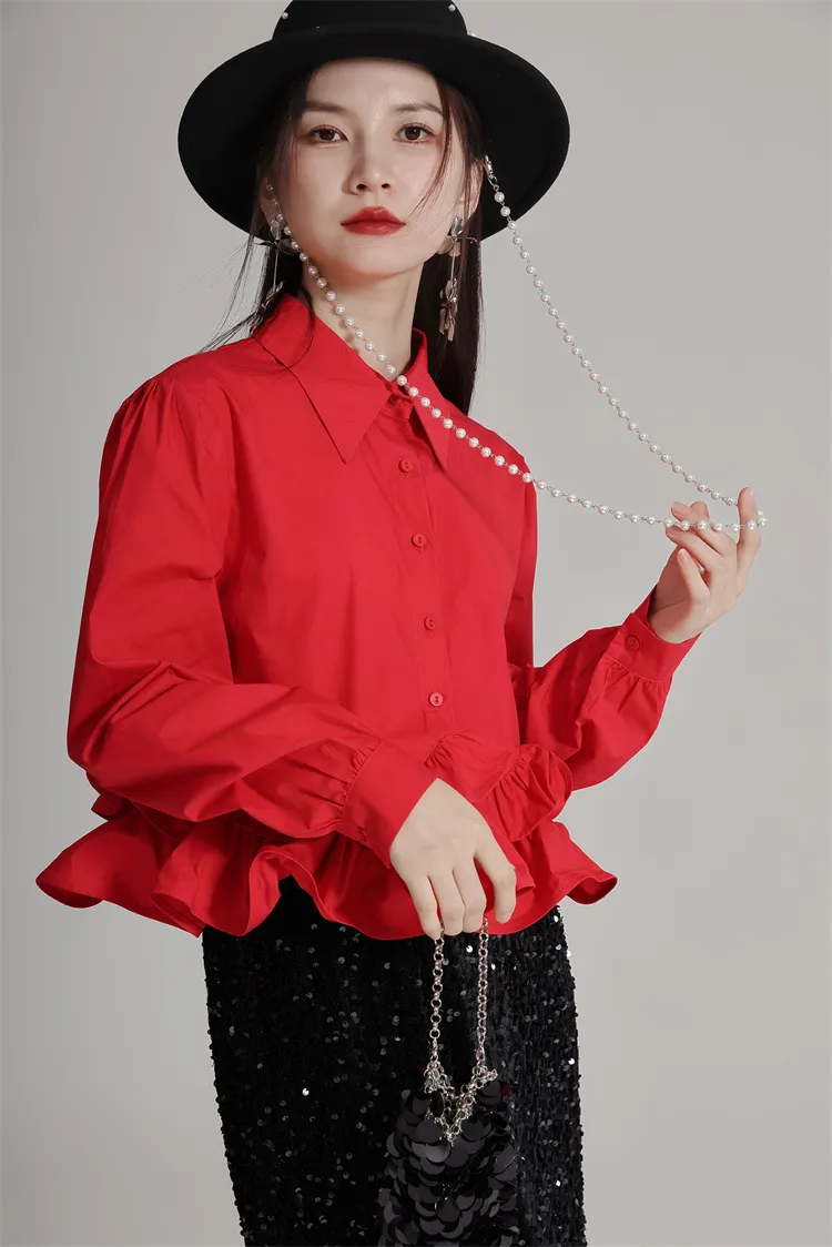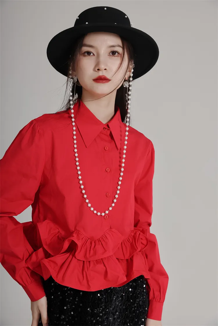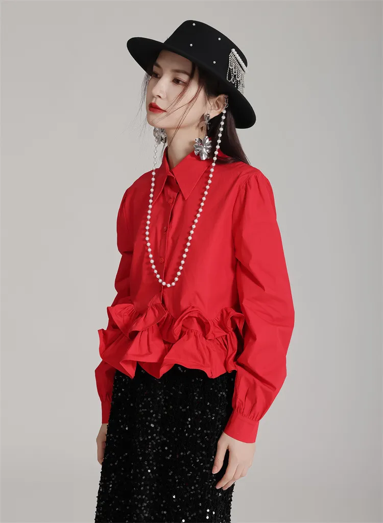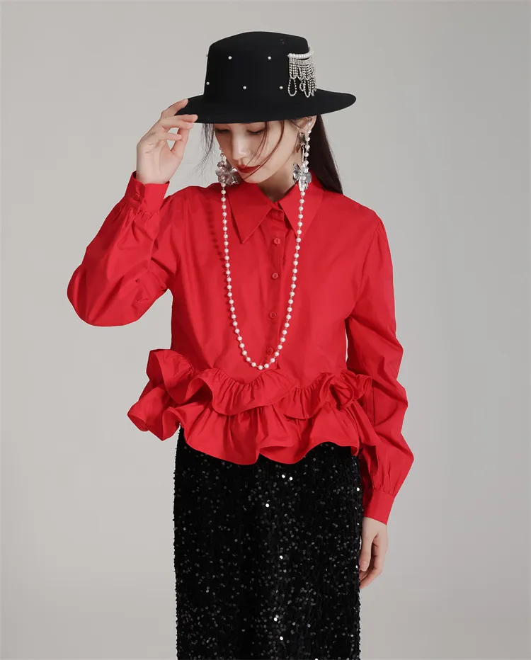 衣都精品- 新款時髦設計褶皺立體木耳邊短款上衣