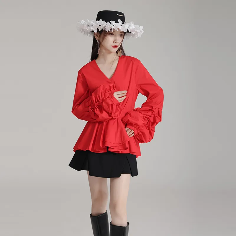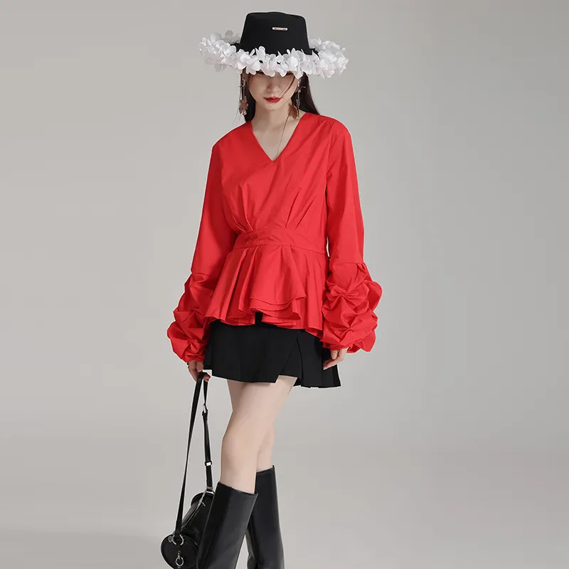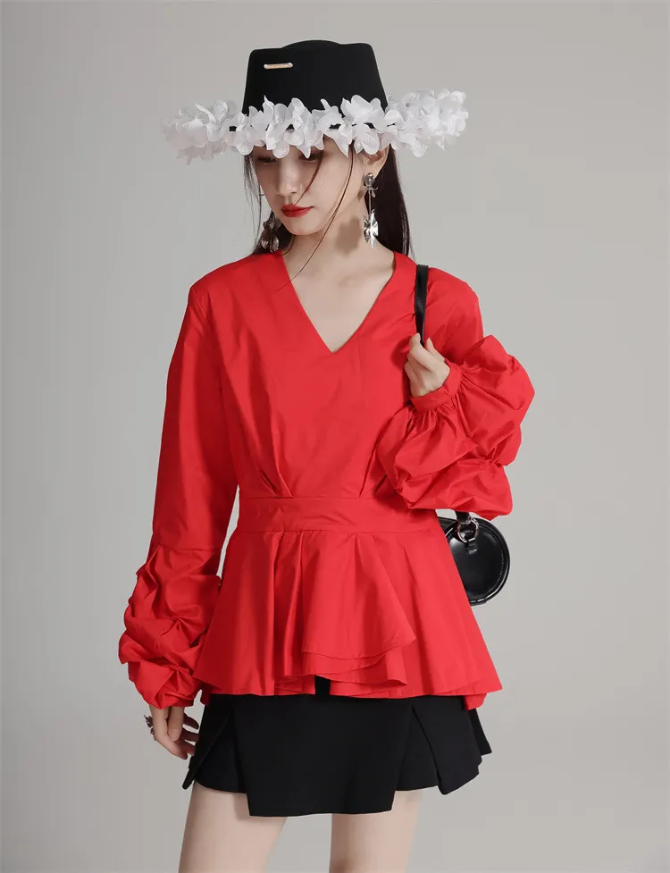 衣都精品- 新款V領顯瘦褶皺拼接立體層次下擺燈籠袖上衣