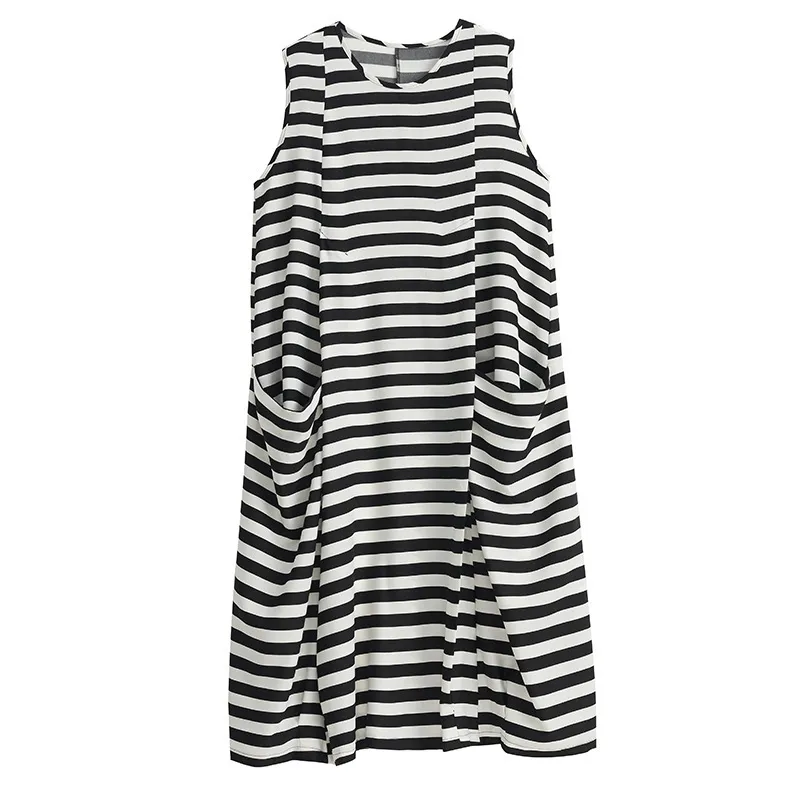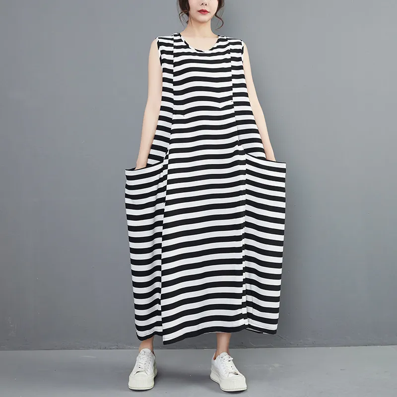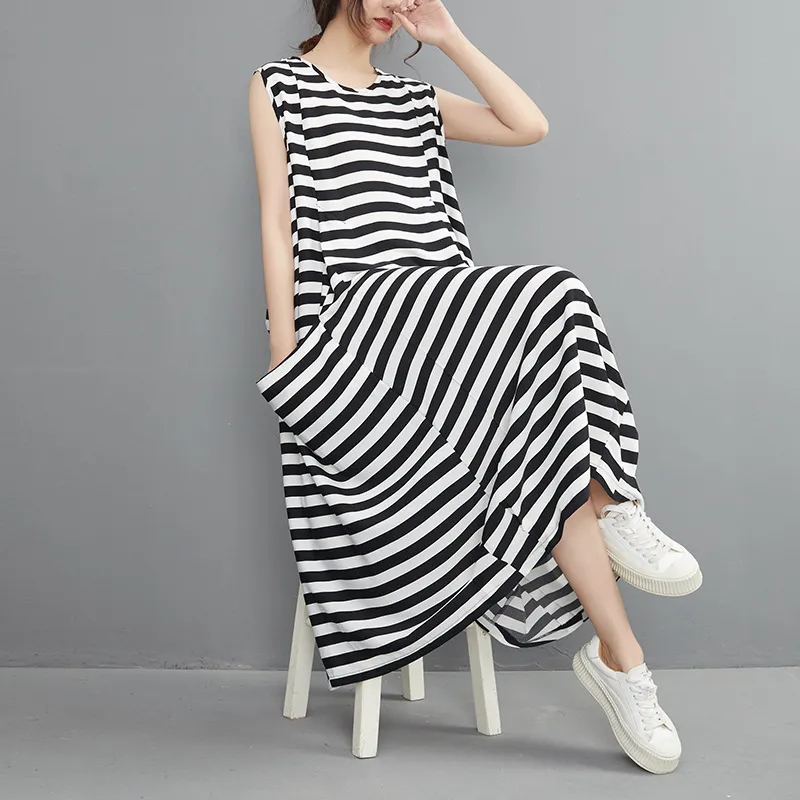 衣都精品- 新款黑白條紋中長款無袖寬鬆連衣裙