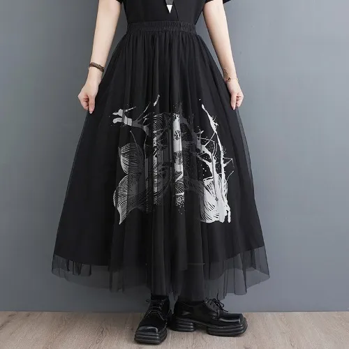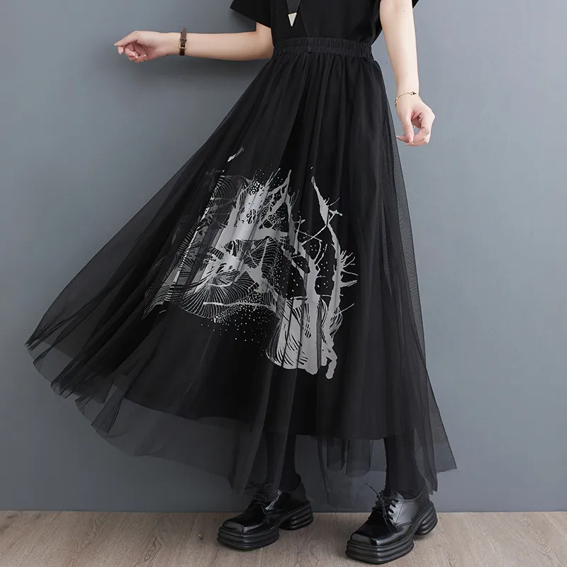 衣都精品- 新款寬鬆暗黑設計感印花拼接網紗半身裙