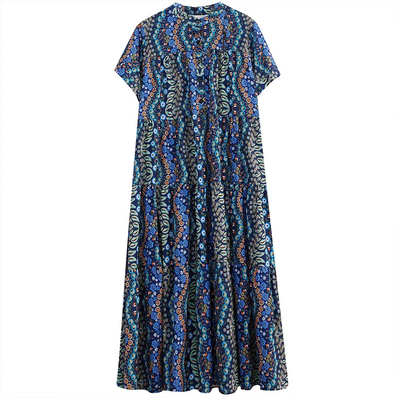 衣都精品- 新款時尚短袖印花休閒拼接大擺連衣裙