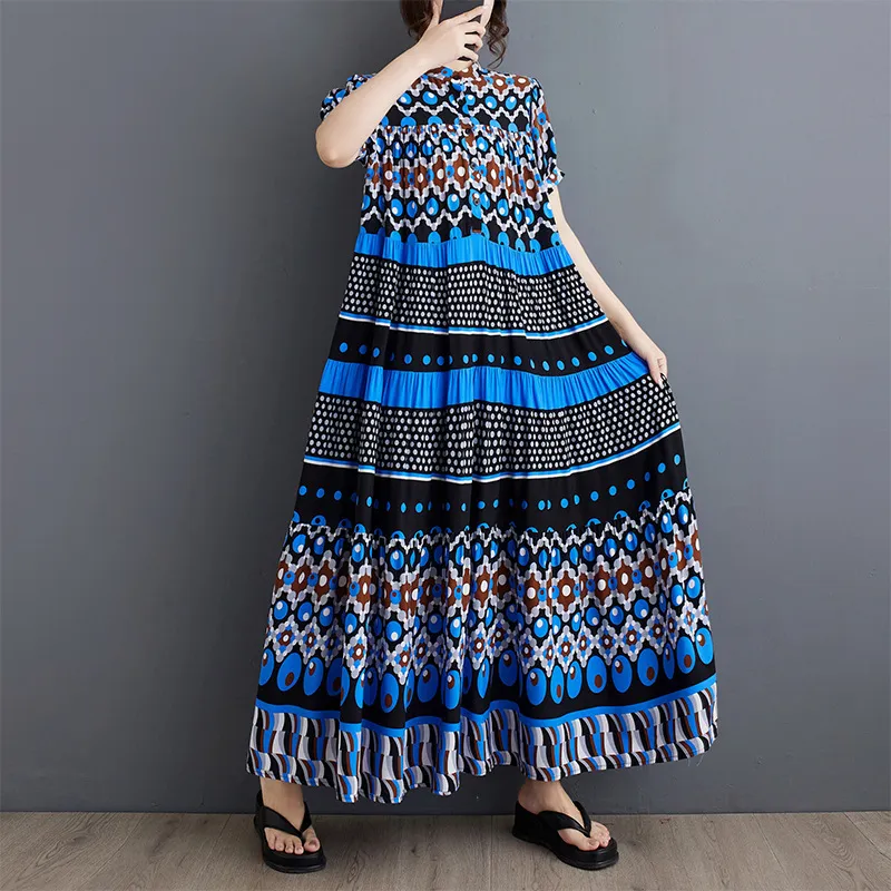衣都精品- 新款復古文藝寬鬆大碼印花褶皺拼接連衣裙