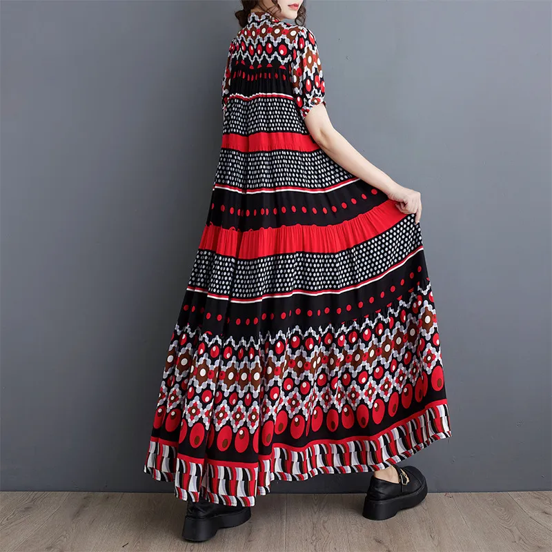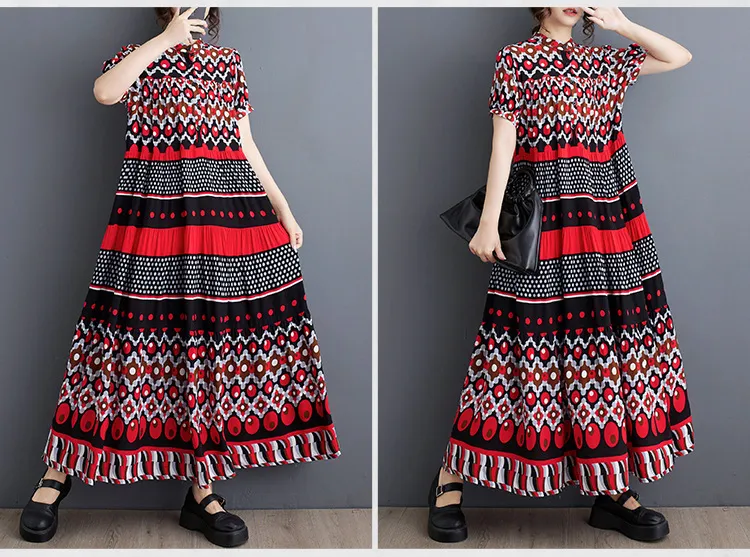 衣都精品- 新款復古文藝寬鬆大碼印花褶皺拼接連衣裙