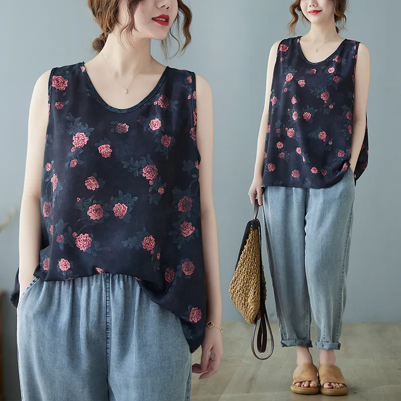 衣都精品- 新款文藝寬鬆花朵印花大碼背心上衣