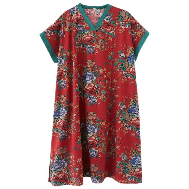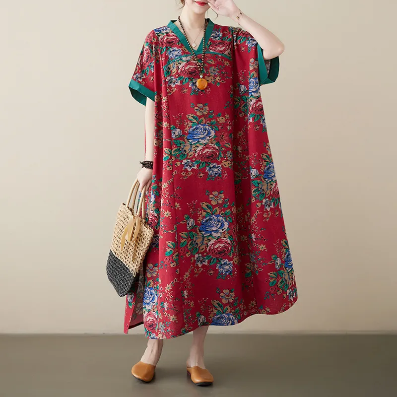 衣都精品- 新款復古印花V領寬鬆大碼連衣裙
