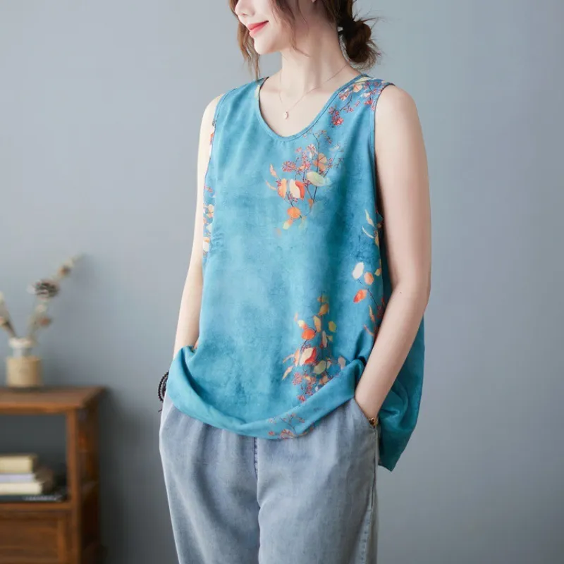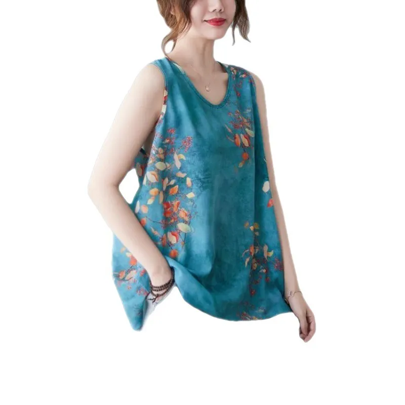 衣都精品- 新款文藝寬鬆花朵印花大碼背心上衣