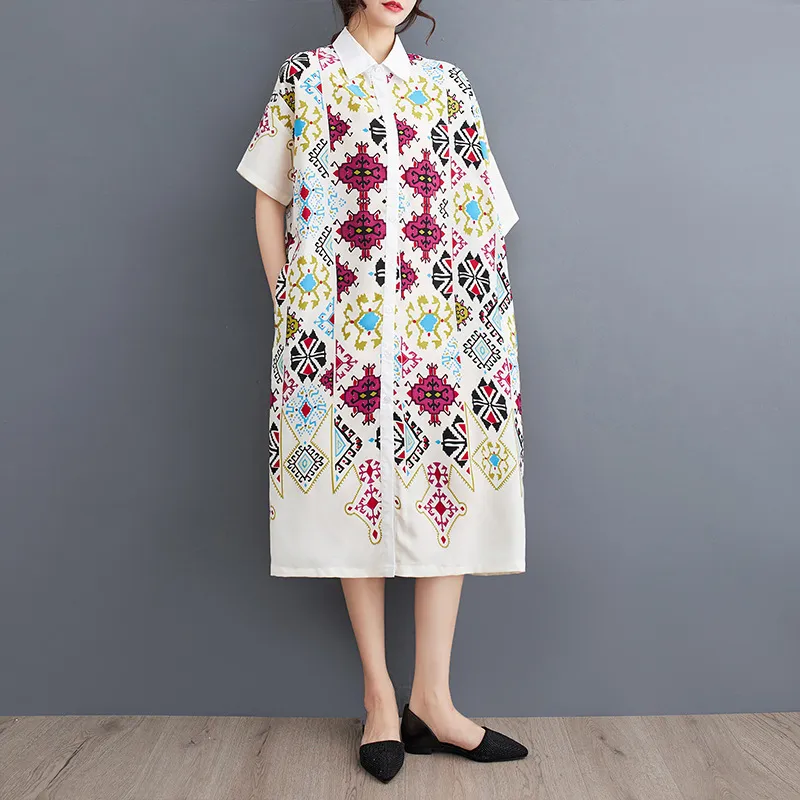 衣都精品- 新款復古印花V領寬鬆大碼連衣裙