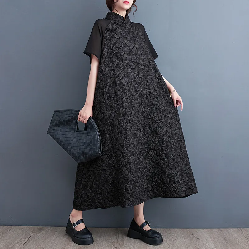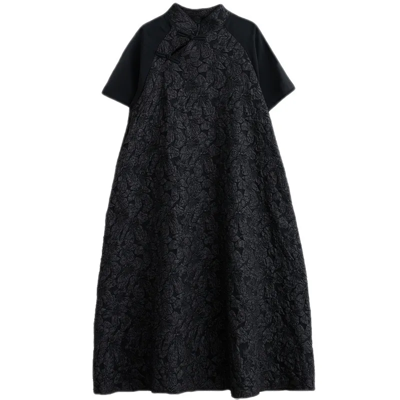 衣都精品- 新款中國風立領盤扣提花拼接大碼連衣裙