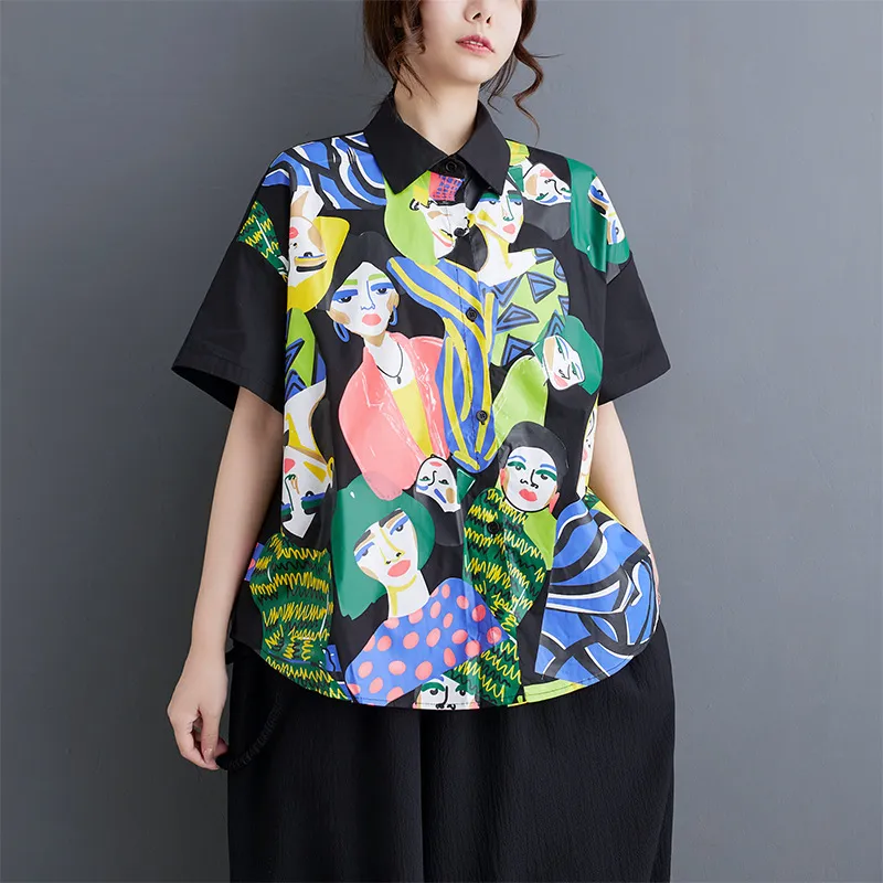 衣都精品- 新款復古印花設計感短袖寬鬆上衣