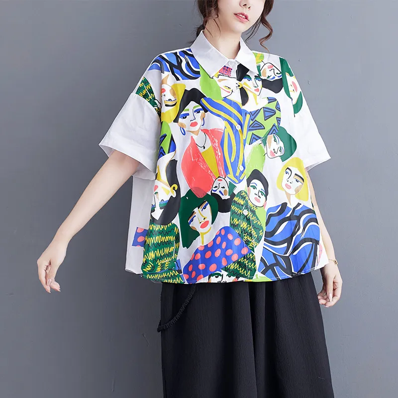 衣都精品- 新款復古印花設計感短袖寬鬆上衣