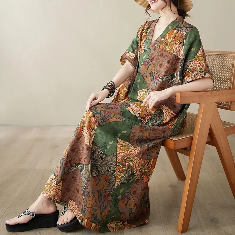衣都精品- 新款大碼寬鬆文藝度假風V領連衣裙