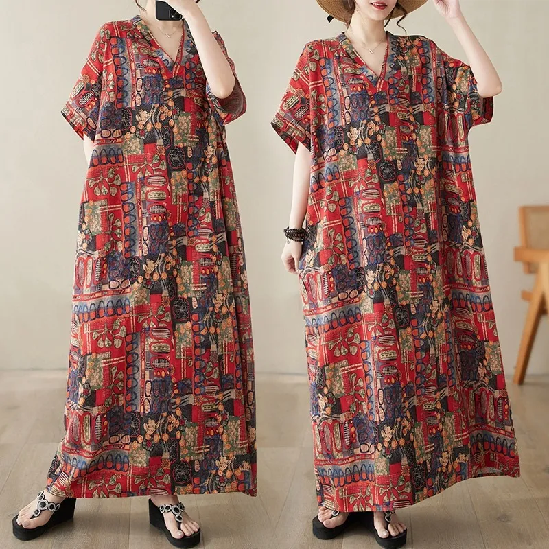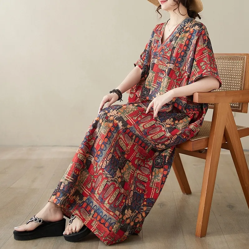 衣都精品- 新款大碼寬鬆文藝度假風V領連衣裙