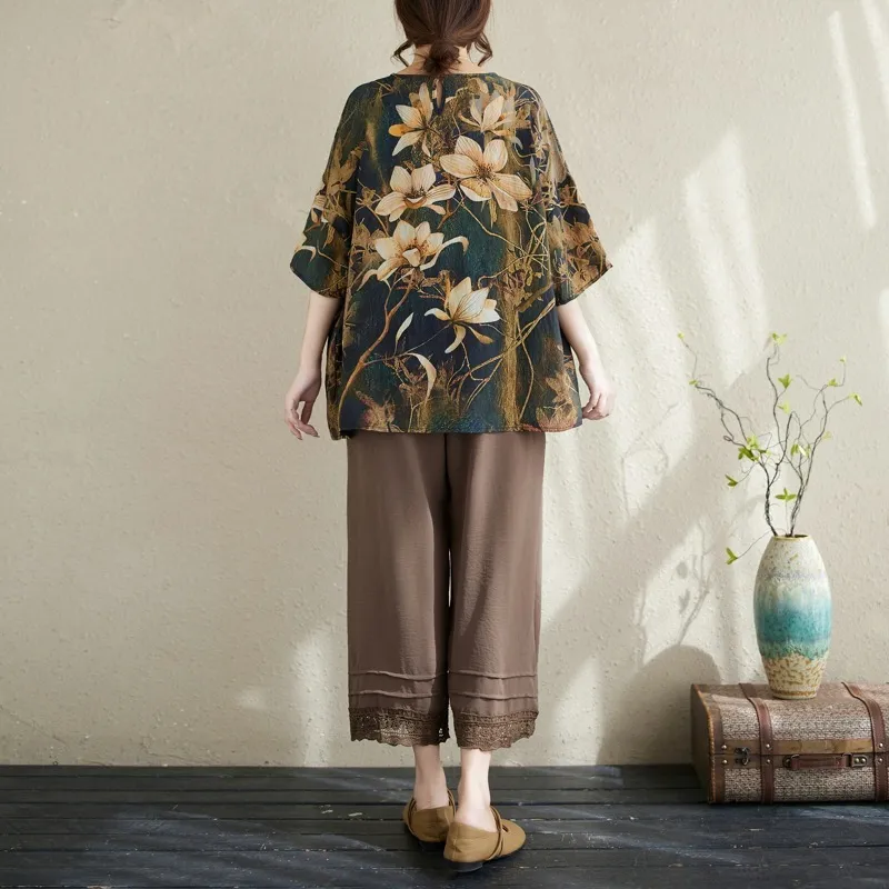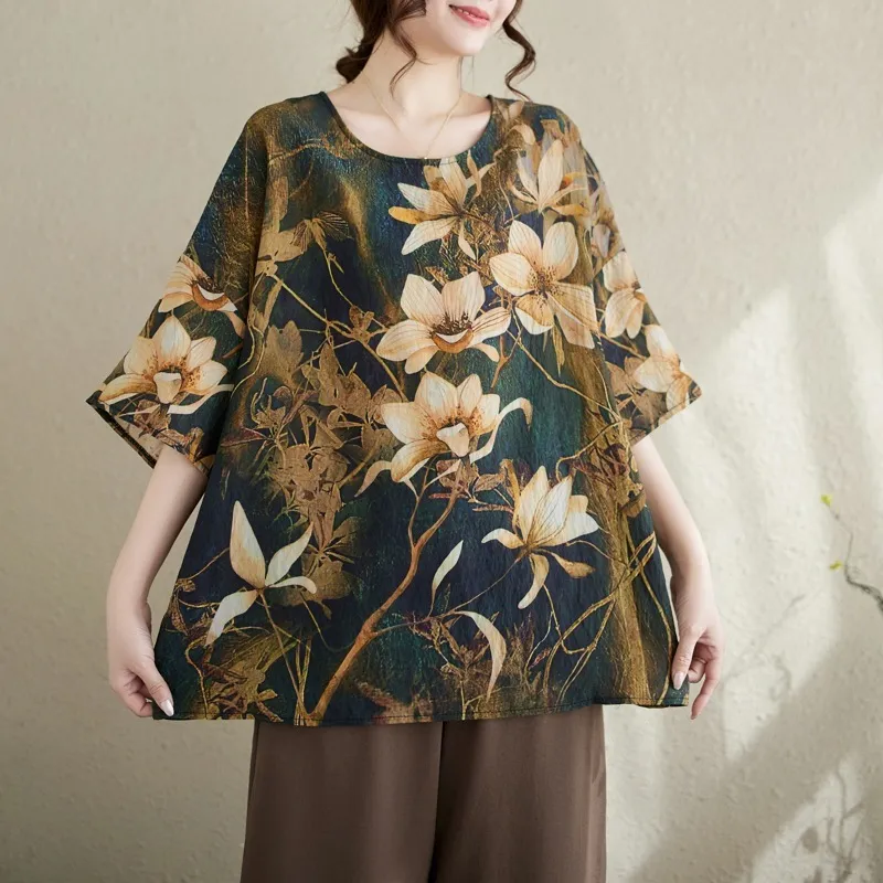 衣都精品- 新款復古印花設計感短袖寬鬆上衣
