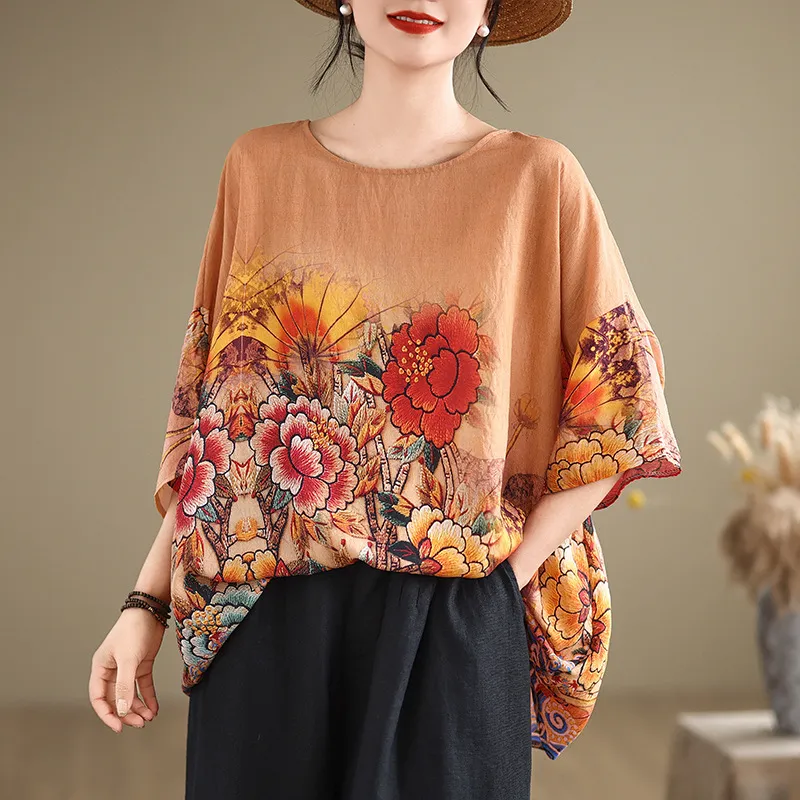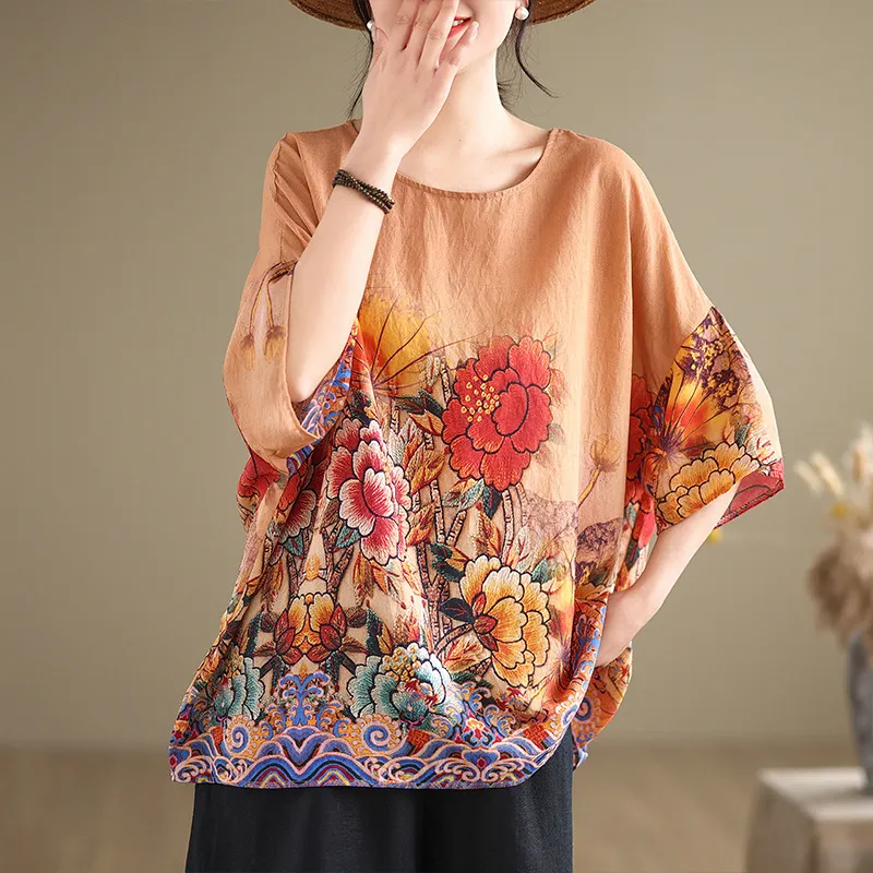 衣都精品- 新款民族風蝙蝠袖寬鬆大碼圓領上衣
