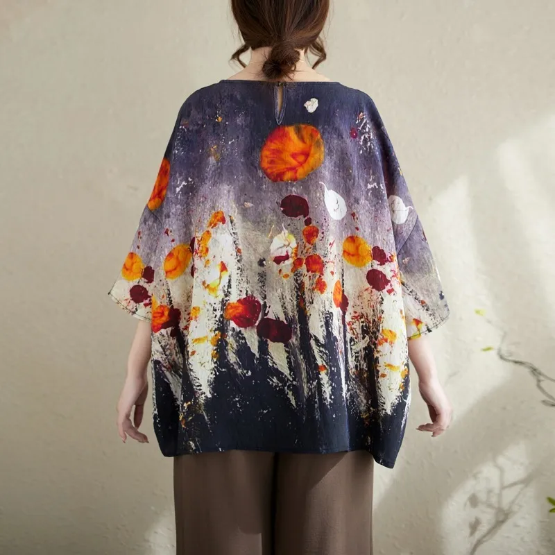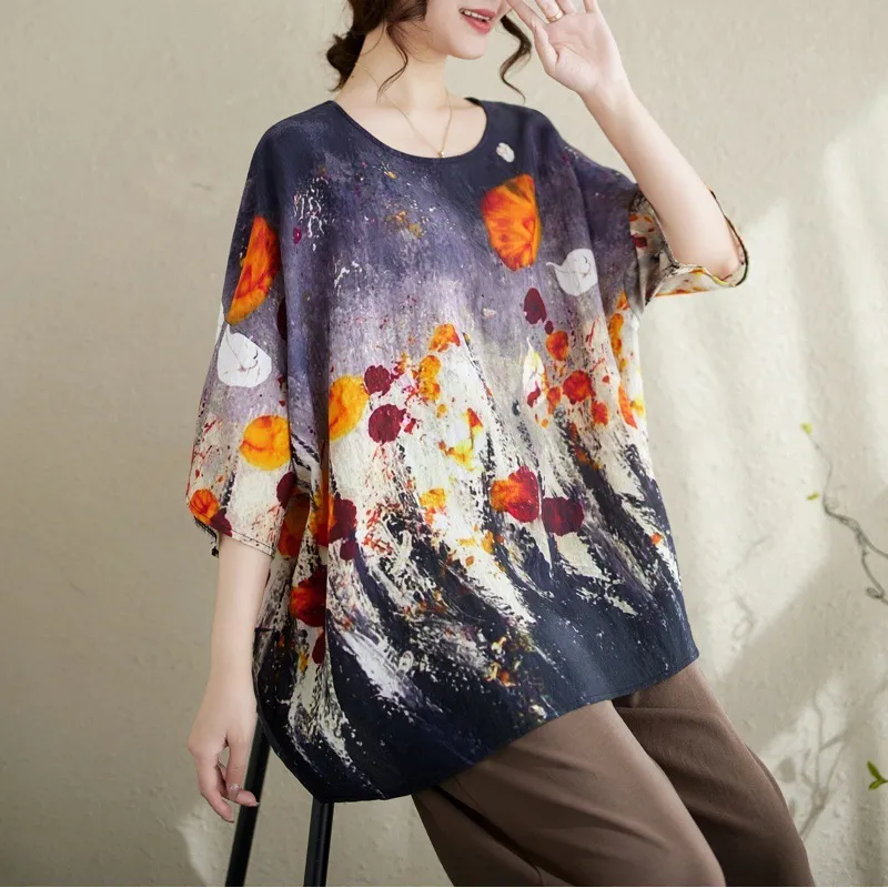 衣都精品- 新款民族風蝙蝠袖寬鬆大碼圓領上衣