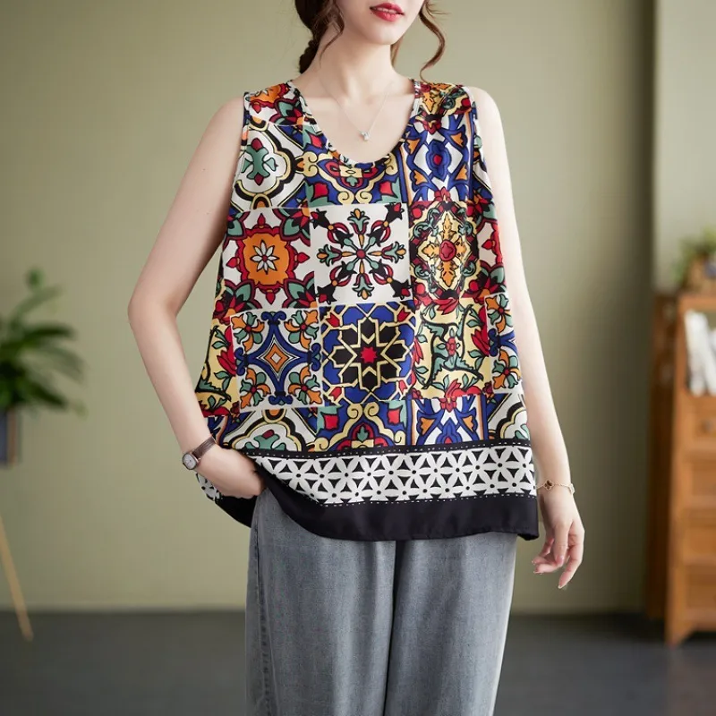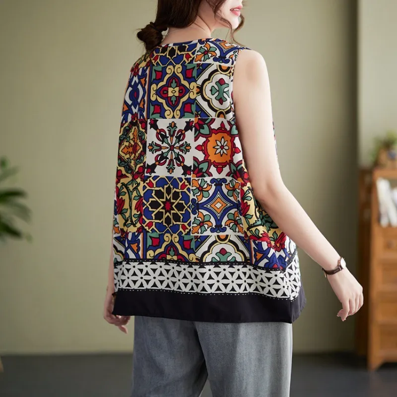 衣都精品- 新款文藝復古民族風印花吊帶背心上衣