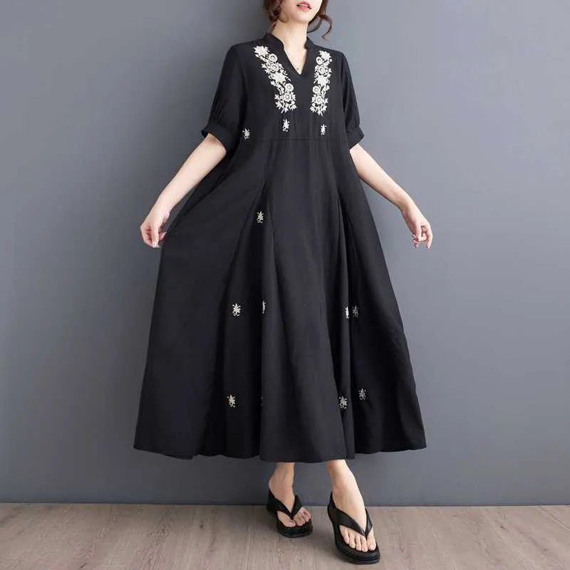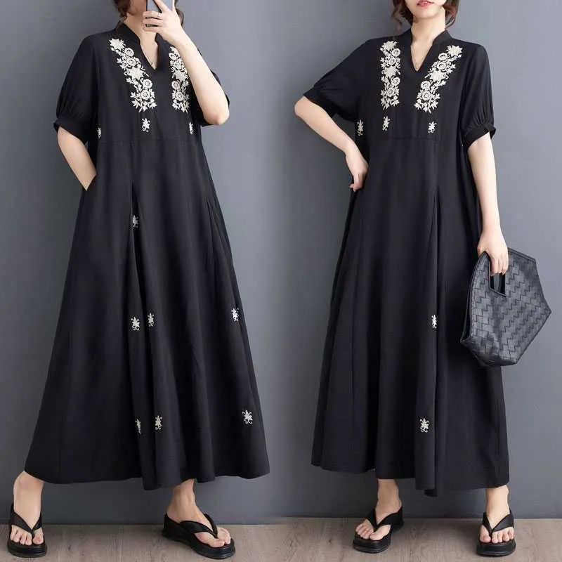 衣都精品- 新款韓版寬鬆花朵刺繡喇叭袖大碼連衣裙