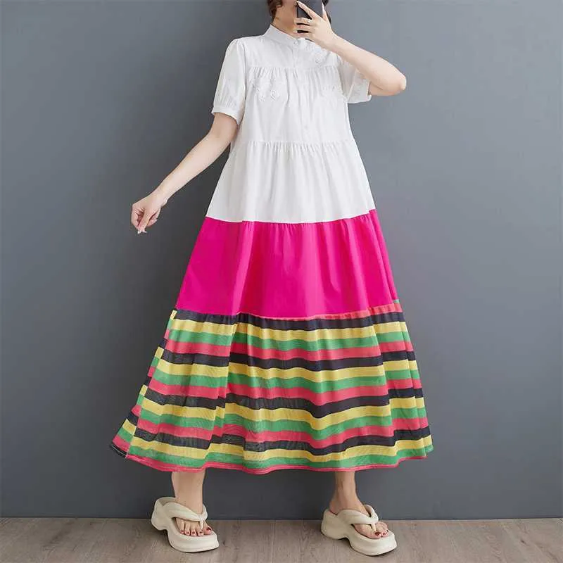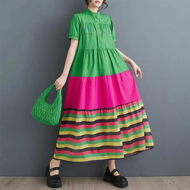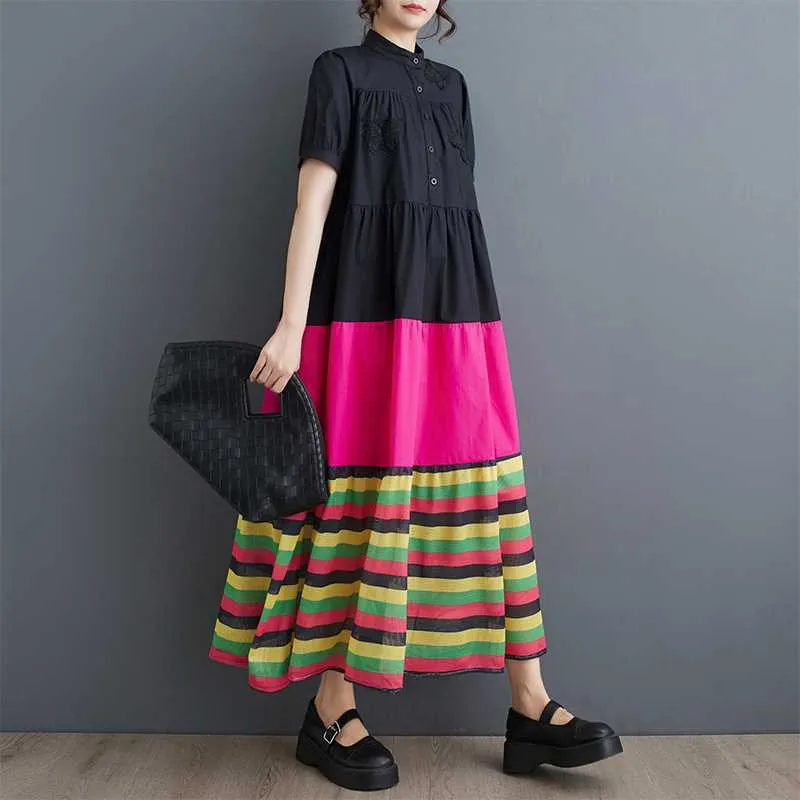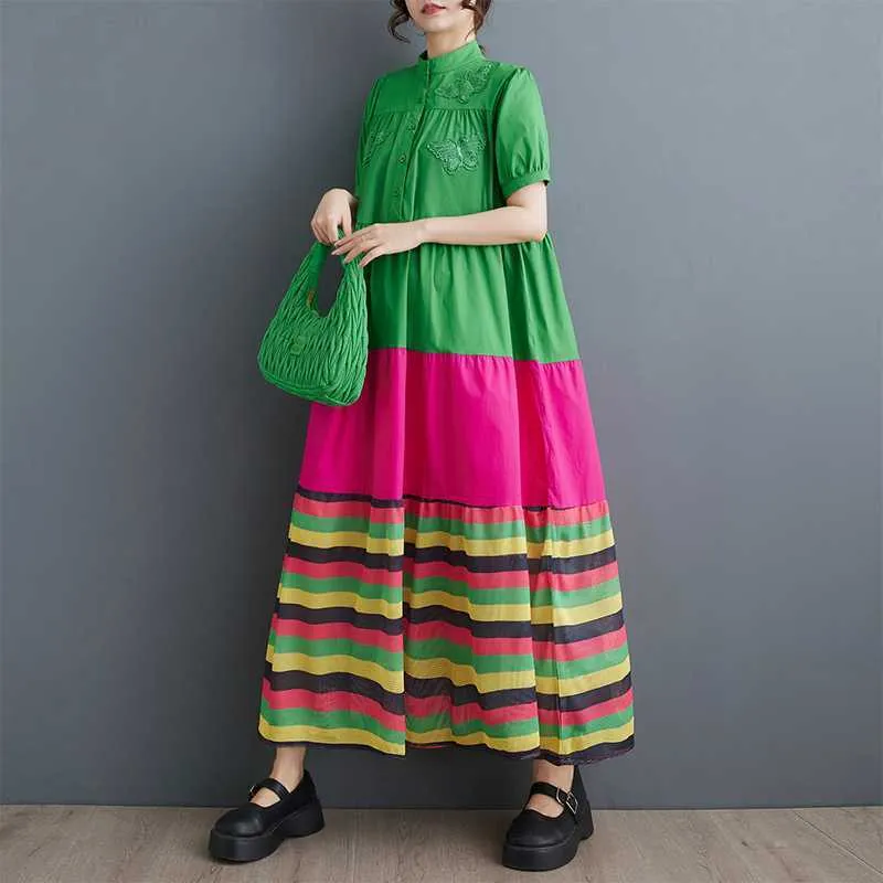 衣都精品- 新款復古刺繡大碼寬鬆紗網撞色連衣裙