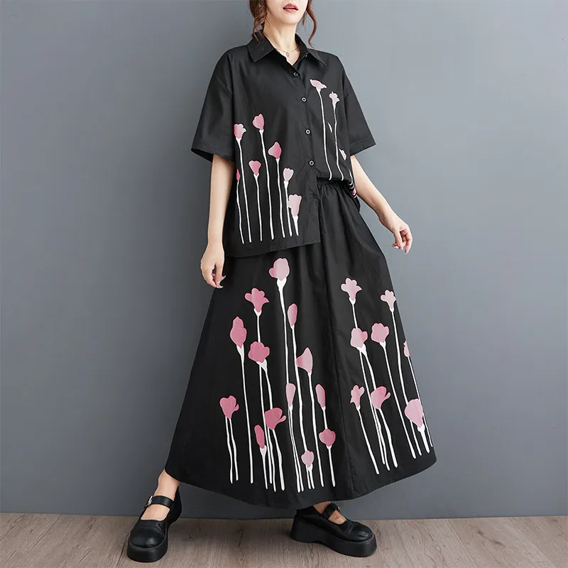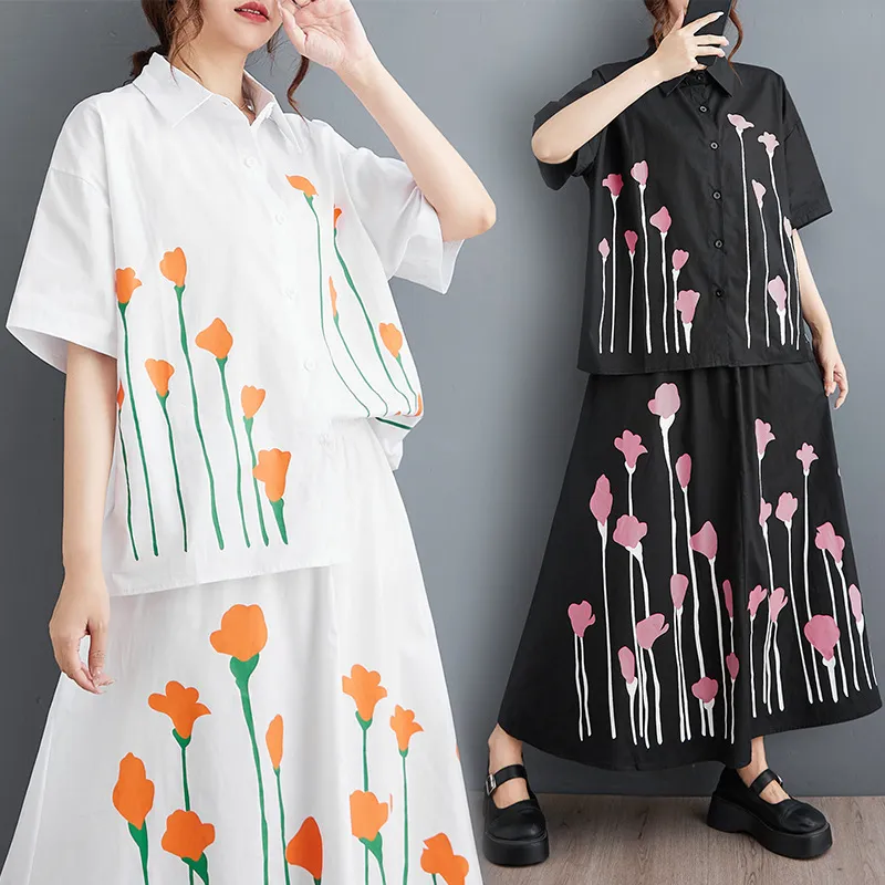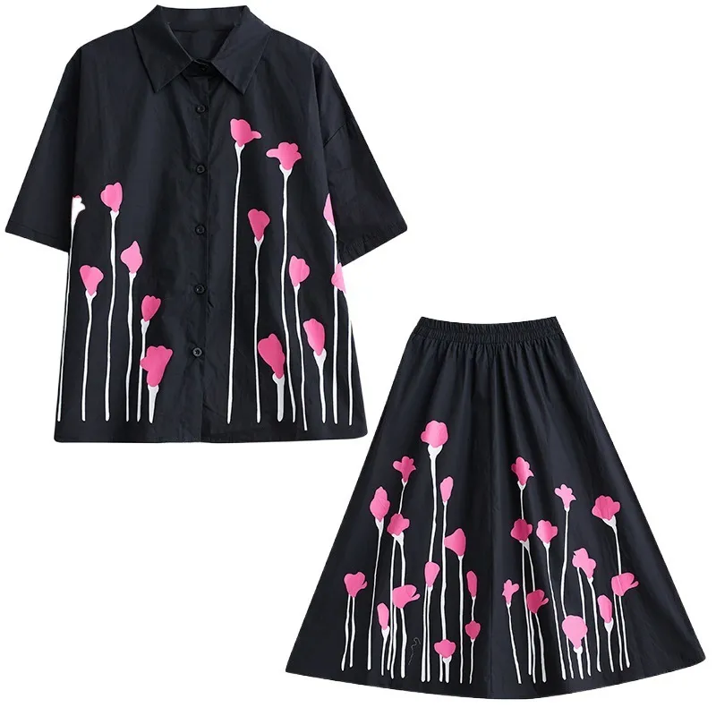 衣都精品- 新款時尚印花寬鬆大碼短袖襯衫+半身裙套裝
