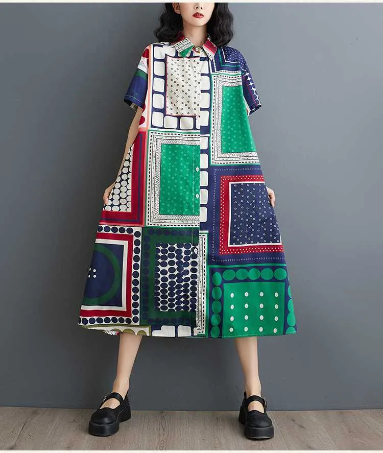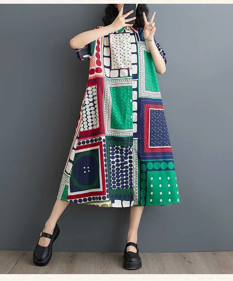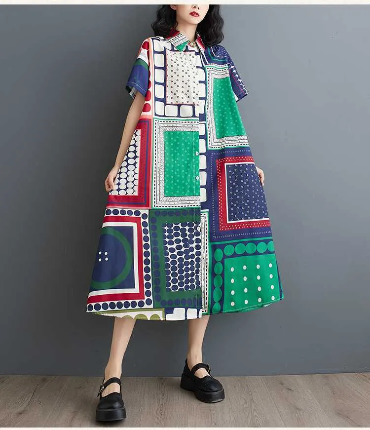 衣都精品- 新款時尚印花寬鬆大碼百搭休閒連衣裙