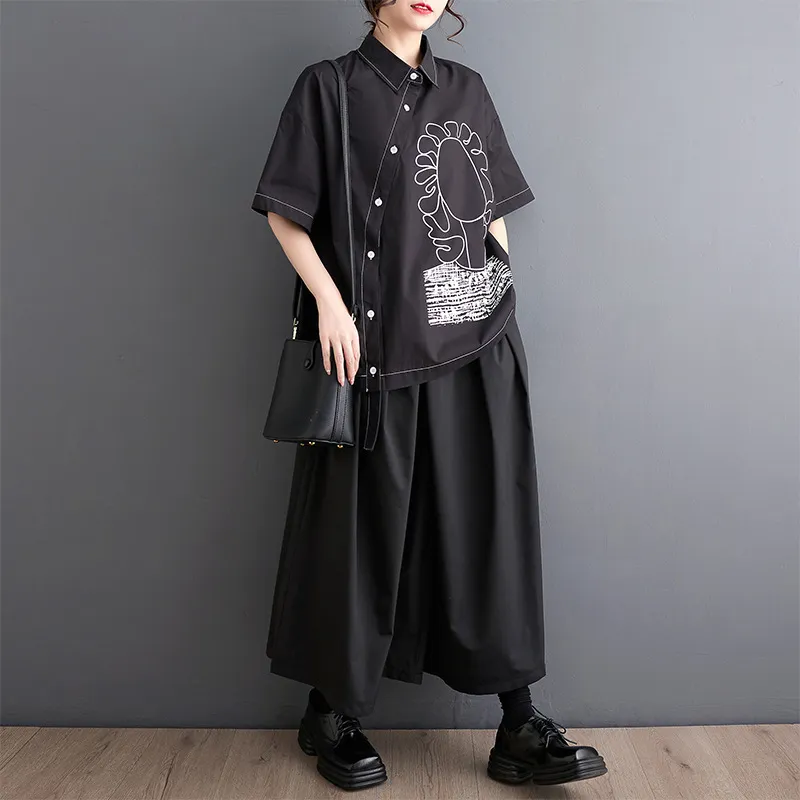 衣都精品- 新款復古設計短袖印花拼接POLO領寬鬆上衣