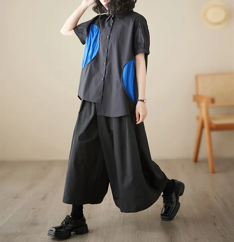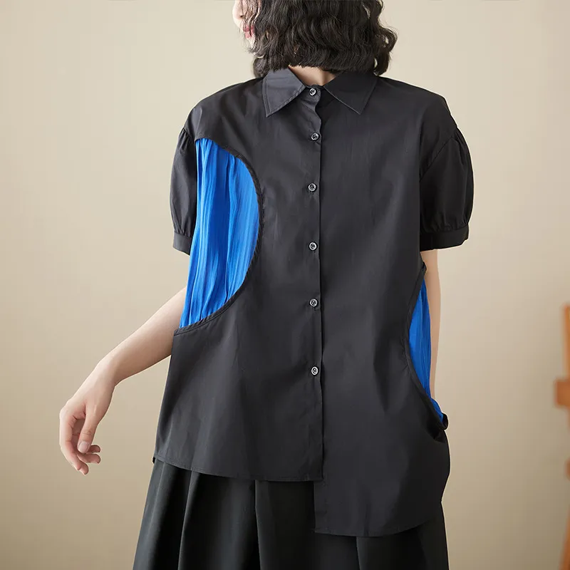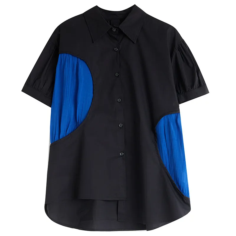 衣都精品- 新款韓版大碼寬鬆個性撞色拼接不對稱上衣