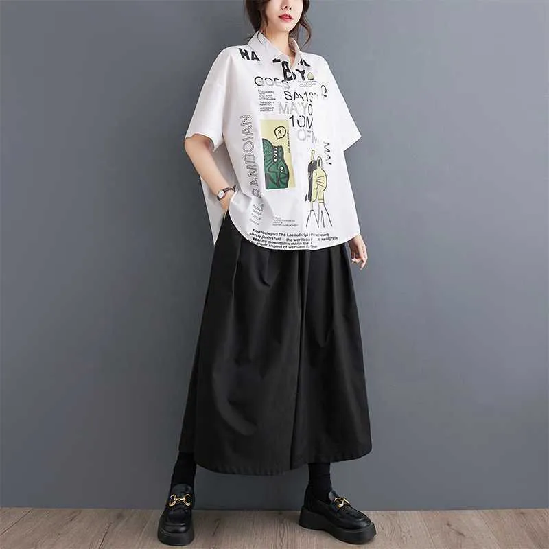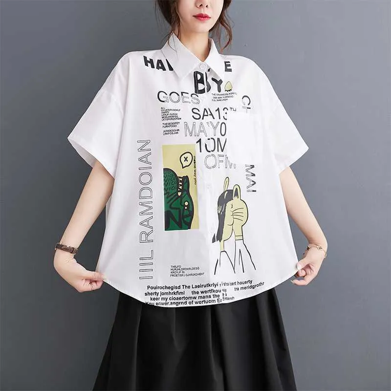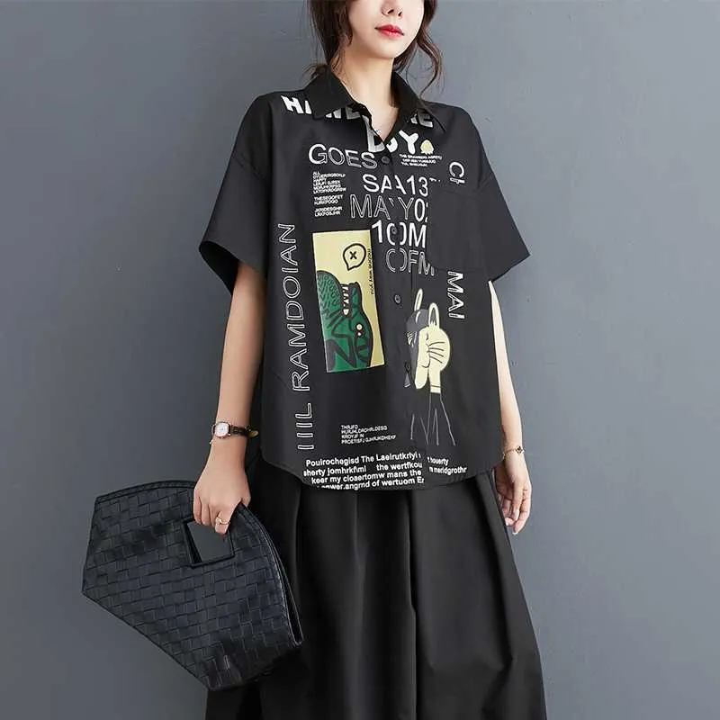 衣都精品- 新款復古印花短袖POLO領寬鬆大碼上衣