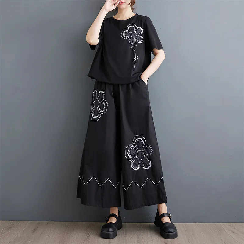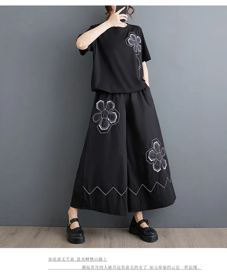 衣都精品- 新款復古暗黑色花朵刺繡休閒時尚闊腿褲