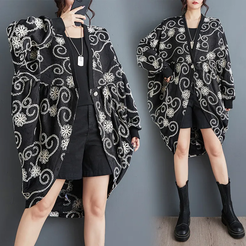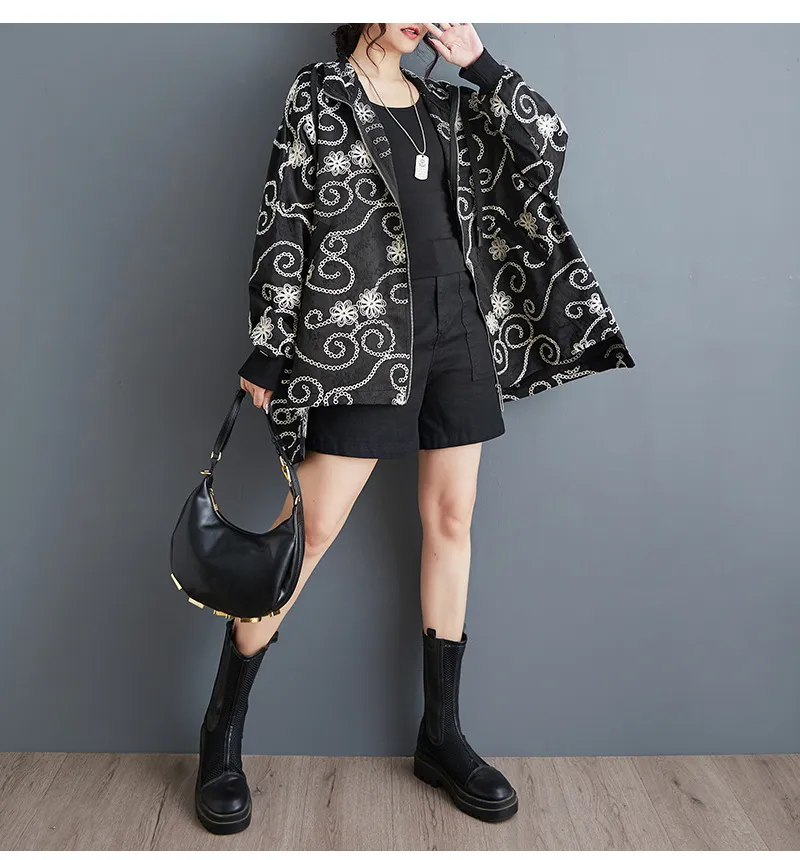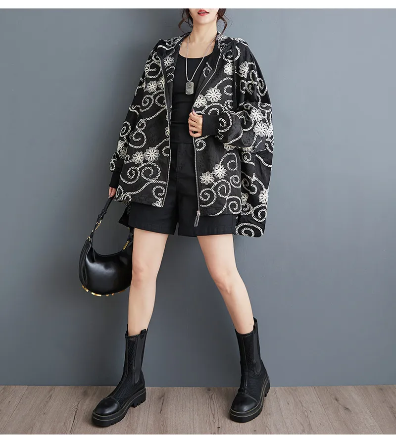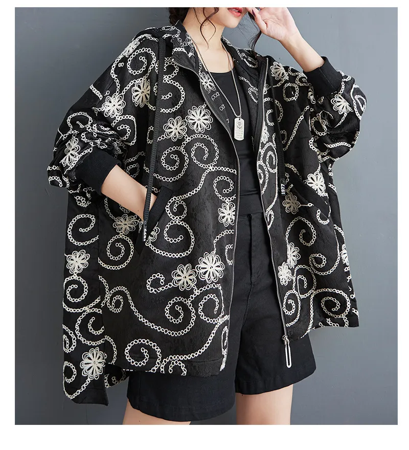 衣都精品- 新款重工刺繡顯瘦大碼拉鍊連帽提花外套