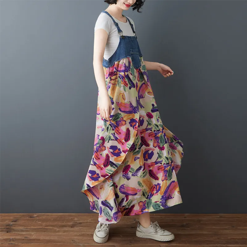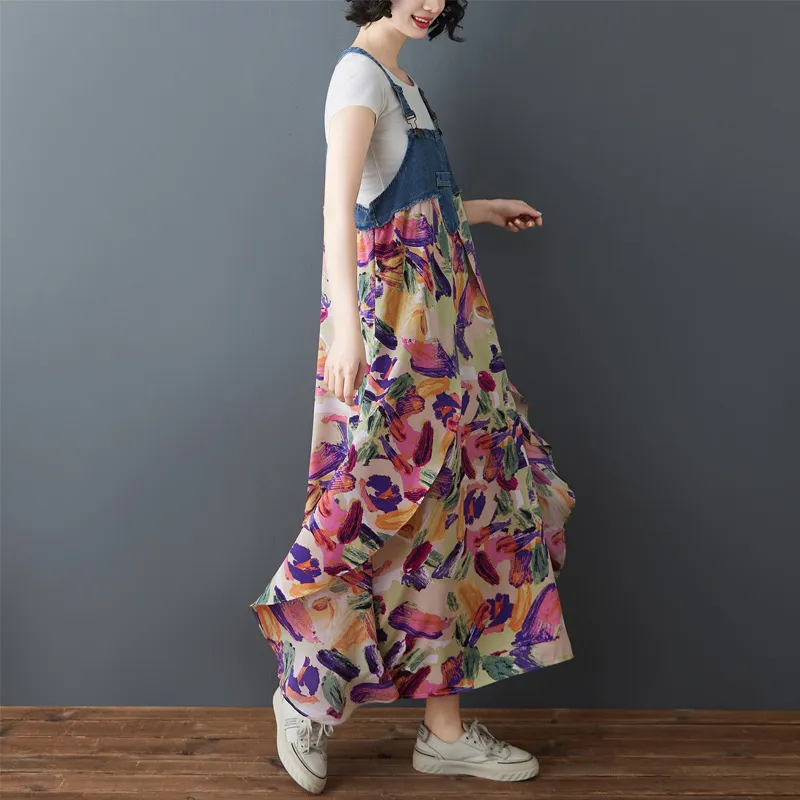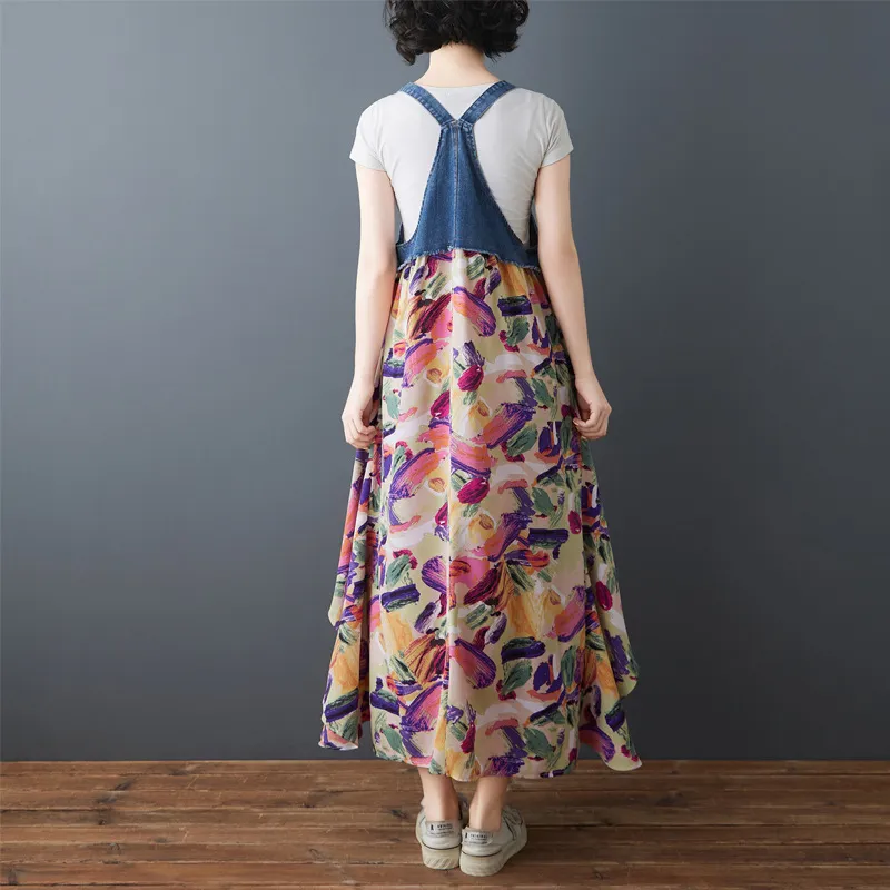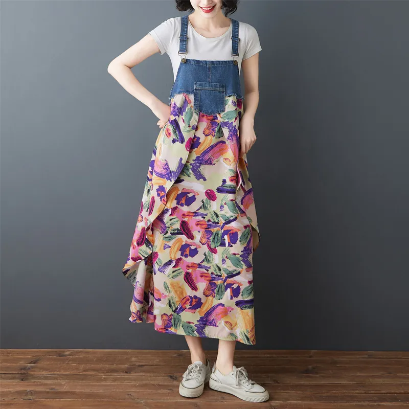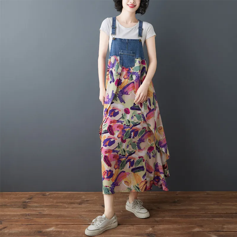 衣都精品- 新款荷葉邊寬鬆雪紡印花牛仔連衣裙