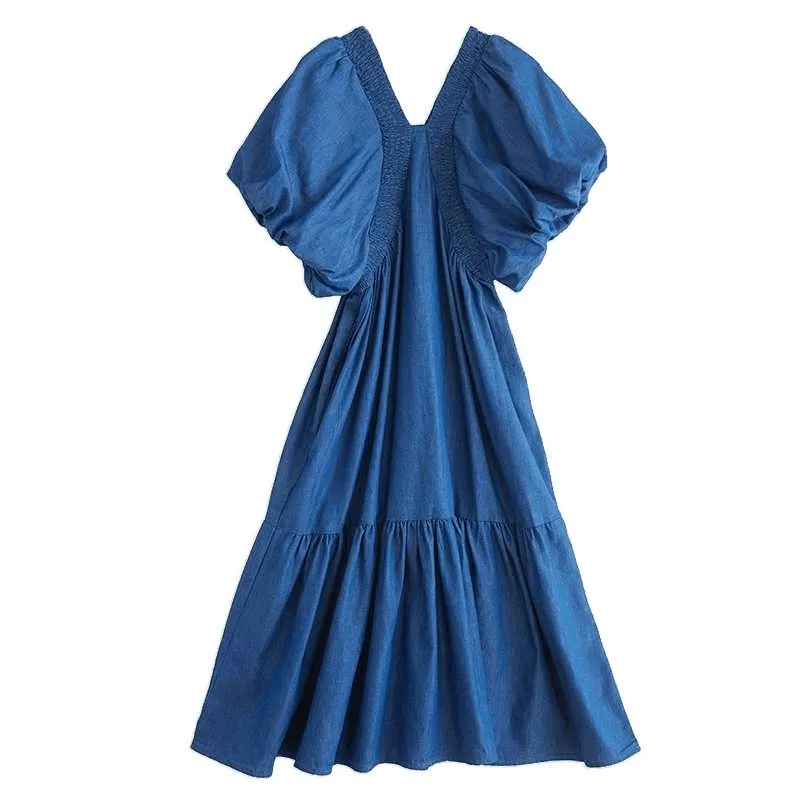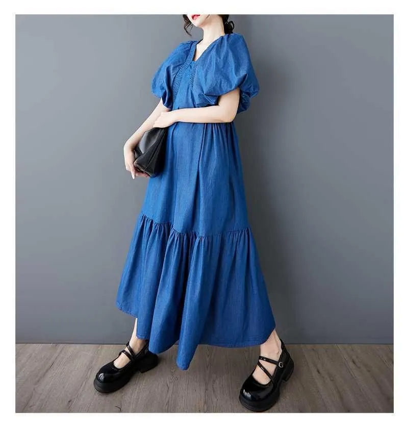 衣都精品- 新款寬鬆復古V領泡泡袖牛仔連衣裙