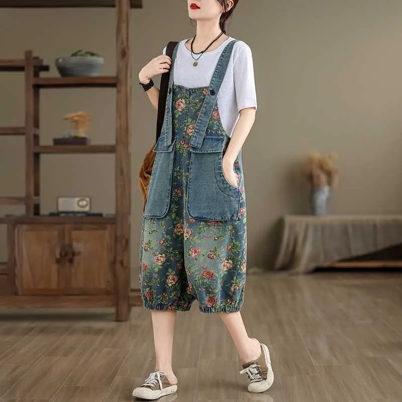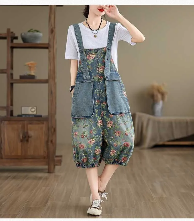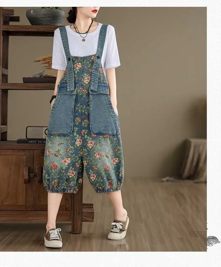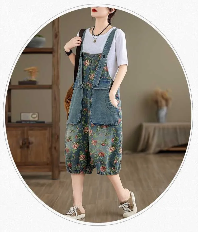 衣都精品- 新款韓版大尺碼牛仔印花寬鬆背帶五分褲