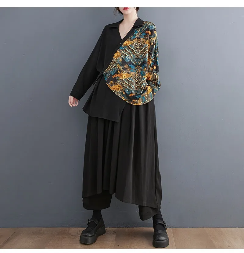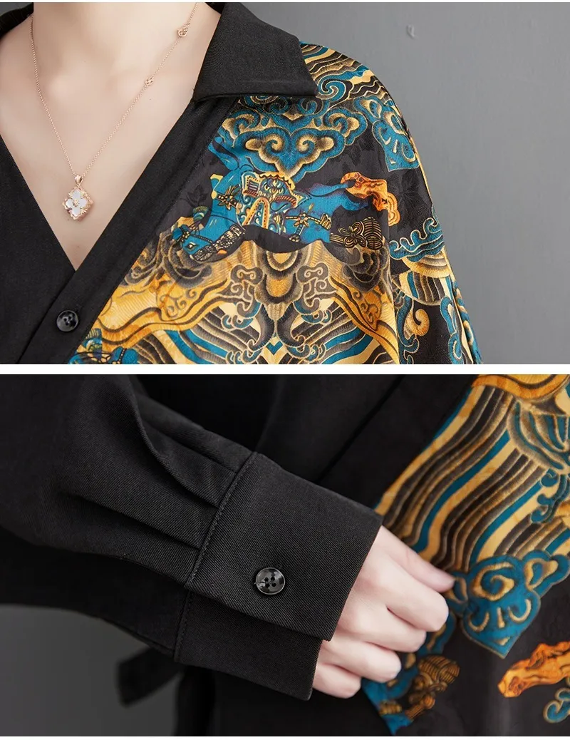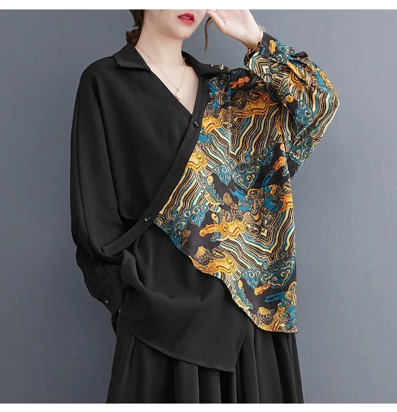 衣都精品- 新款復古大碼寬鬆印花拼接顯瘦收腰上衣