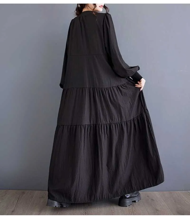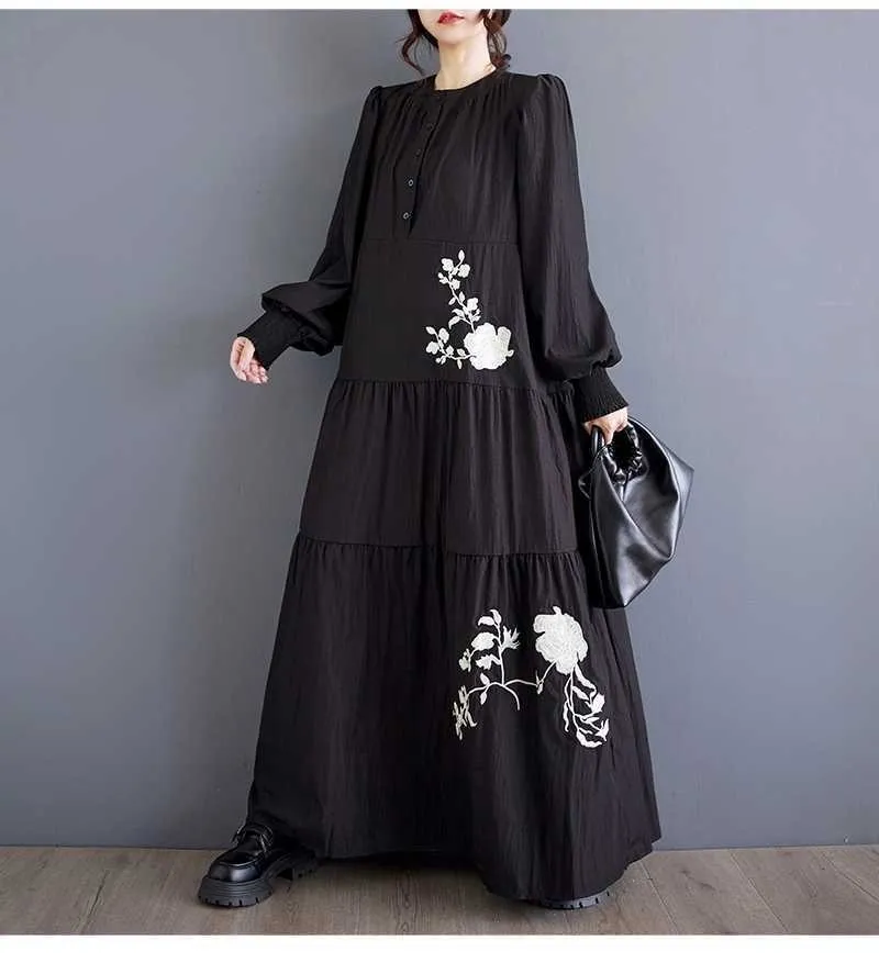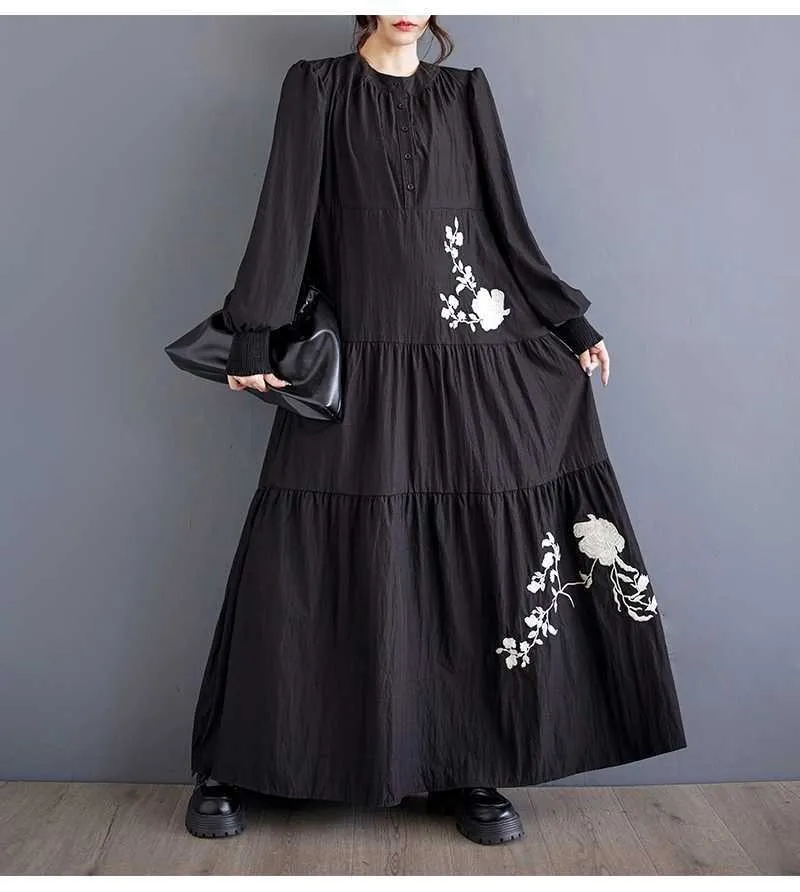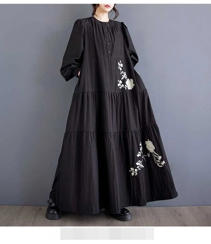 衣都精品- 新款韓版大碼寬鬆立領刺繡花朵多層拼接連衣裙