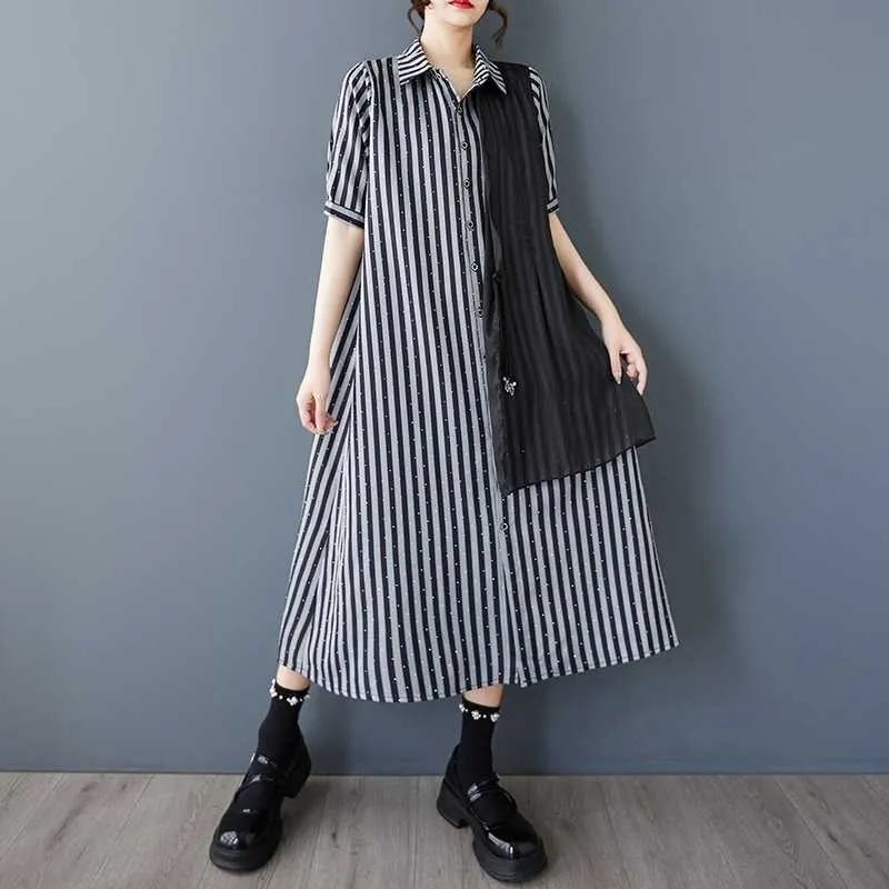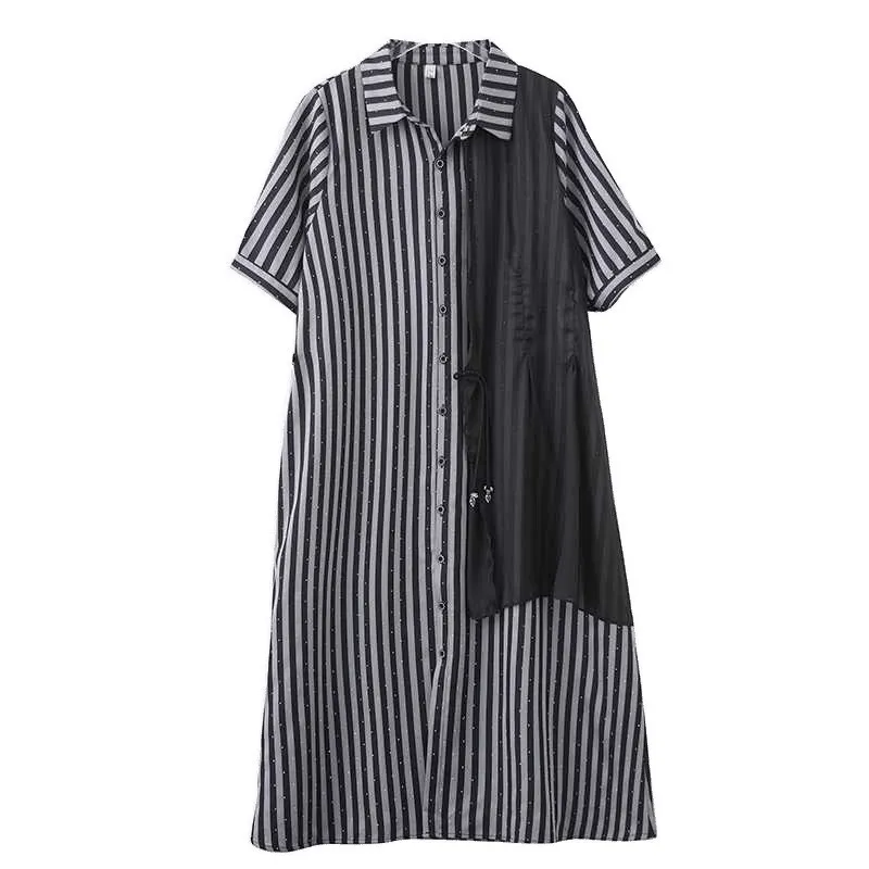 衣都精品- 新款韓版時尚條紋燙鑽拼接繫帶連衣裙