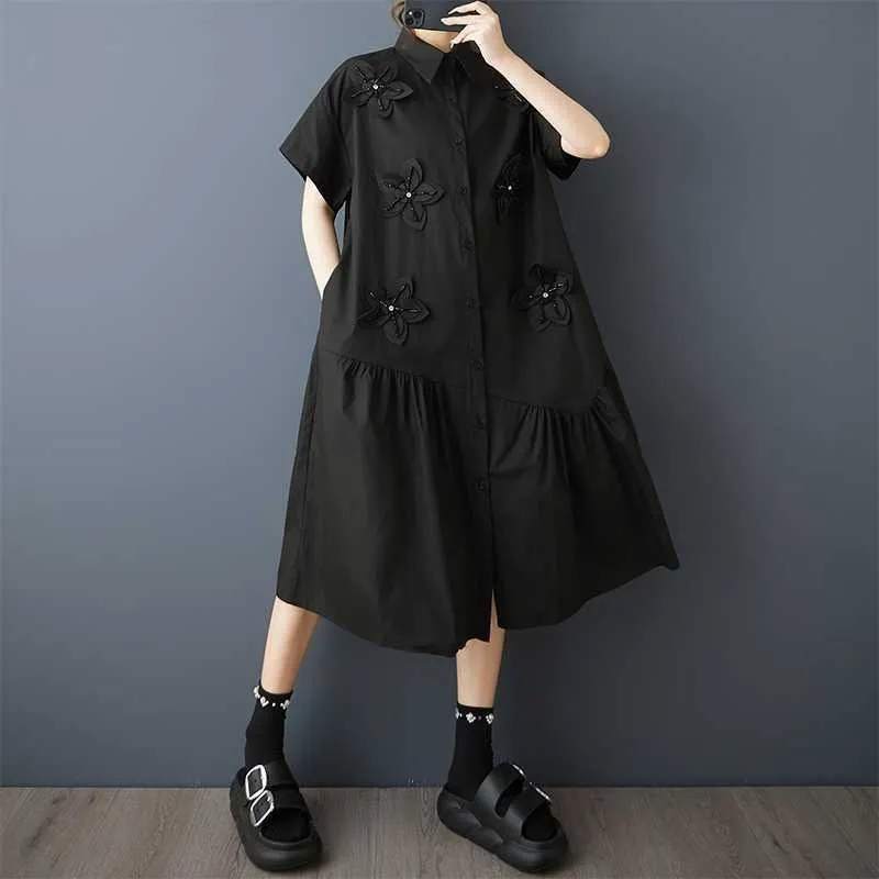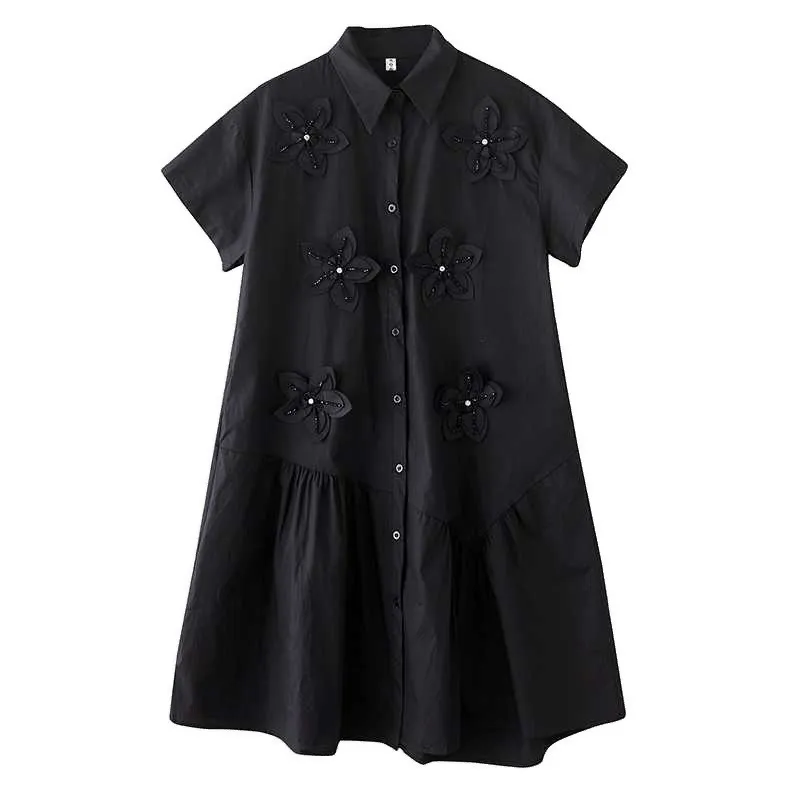 衣都精品- 新款韓版寬鬆大碼珠花拼接短袖連衣裙