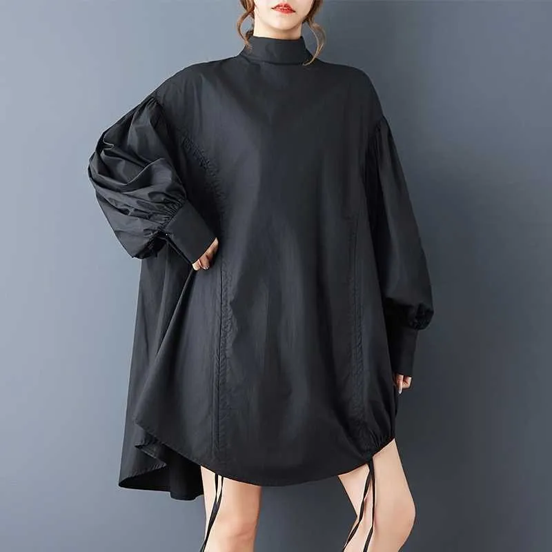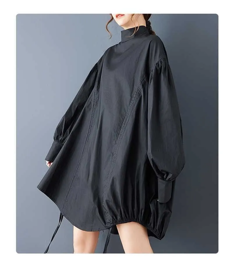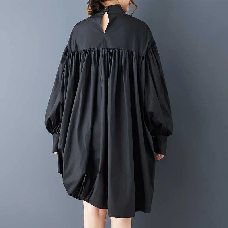 衣都精品- 新款泡泡袖立領繫帶抽繩寬鬆赫本風連身裙
