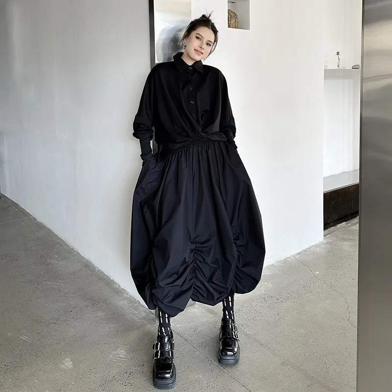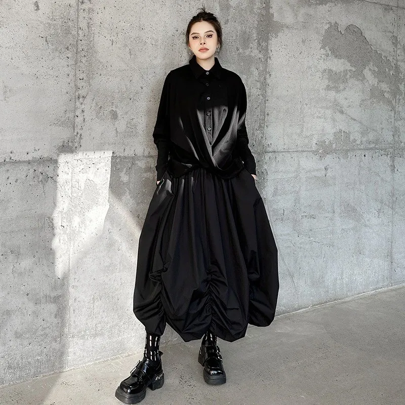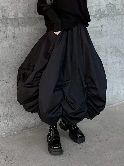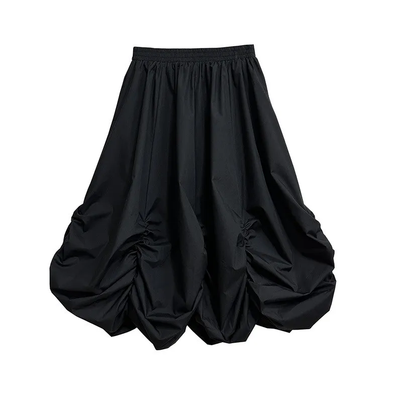 衣都精品- 新款暗黑風抽褶寬鬆高腰蓬蓬半身裙