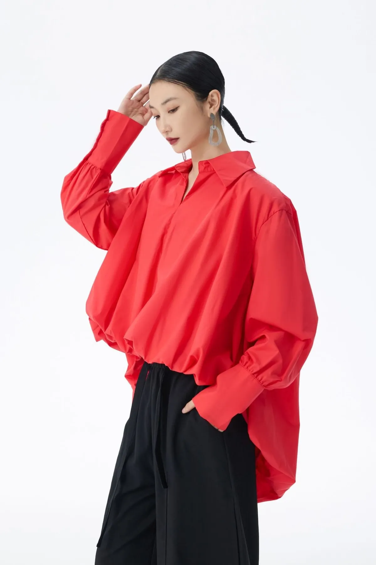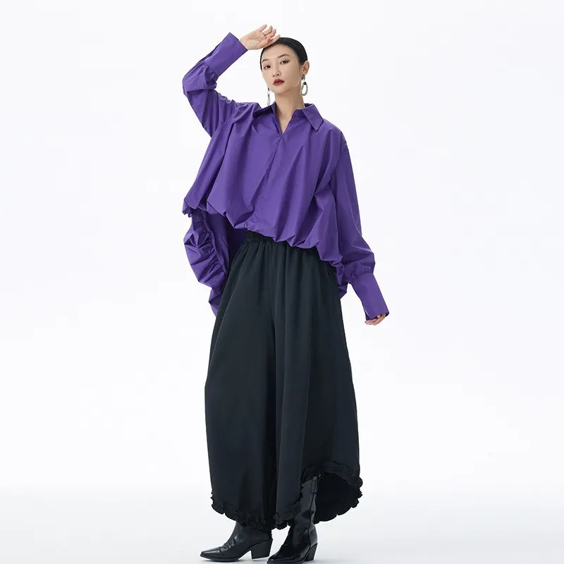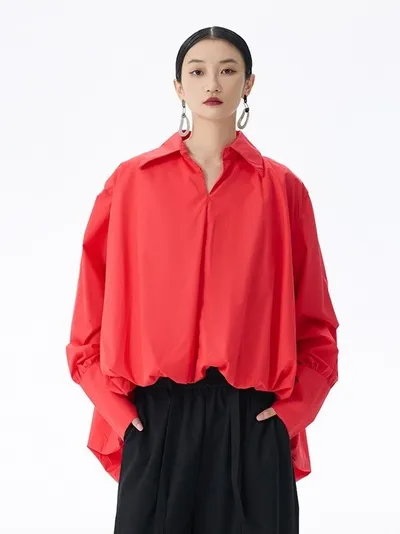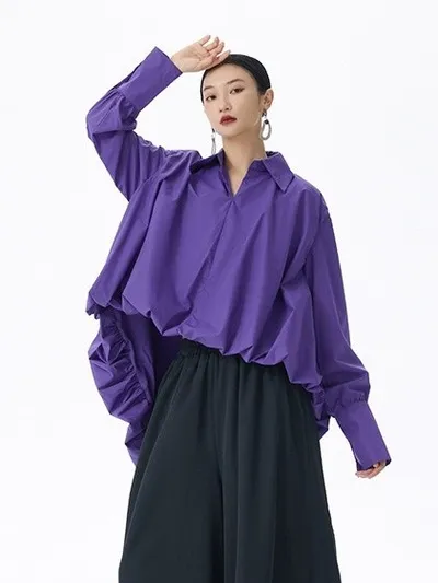 衣都精品- 新款法式氣質V領慵懶不規則褶皺上衣