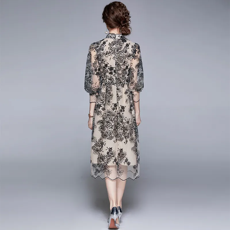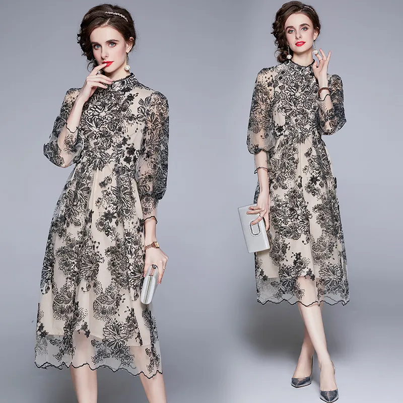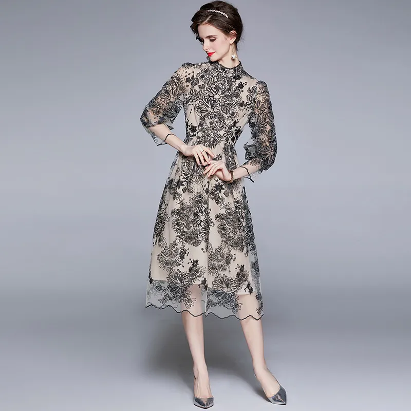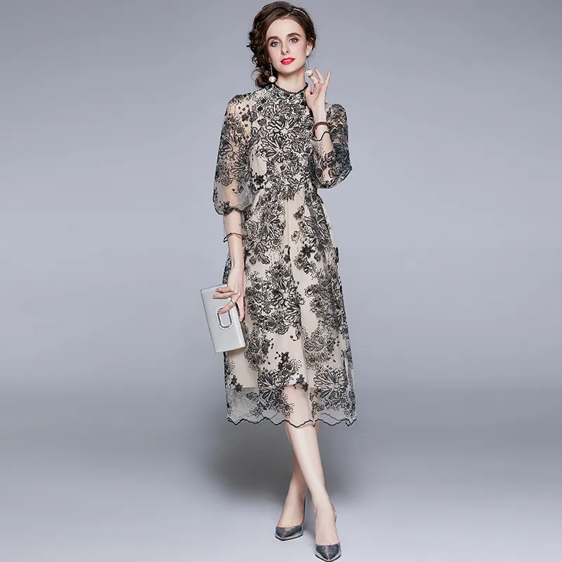 衣都精品- 2023新款溫柔甜美收腰繡花七分袖連衣裙