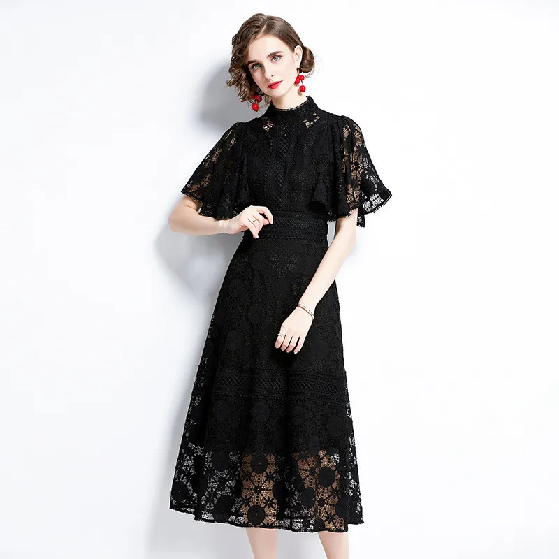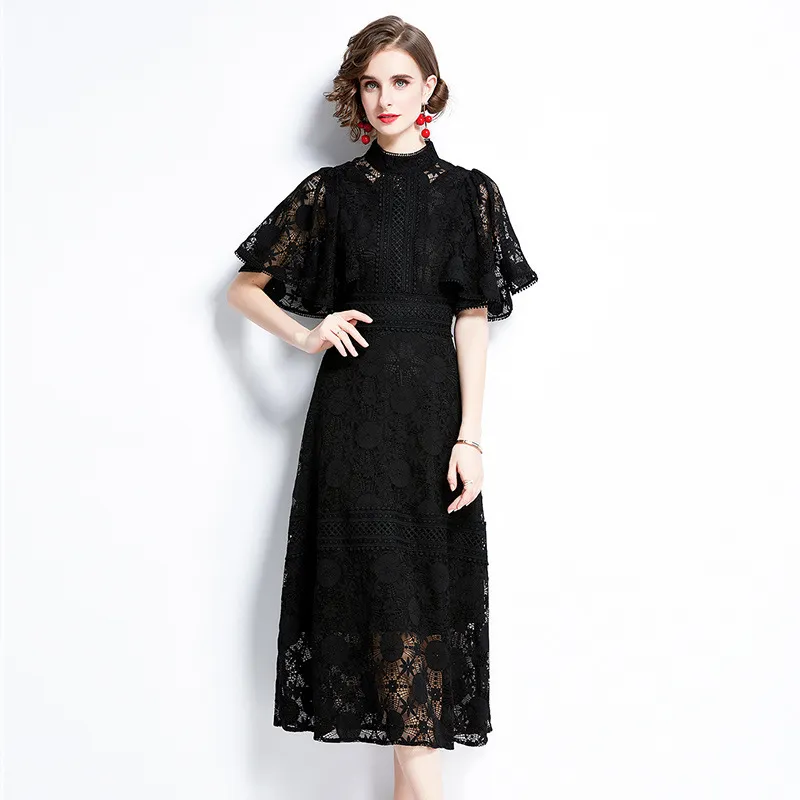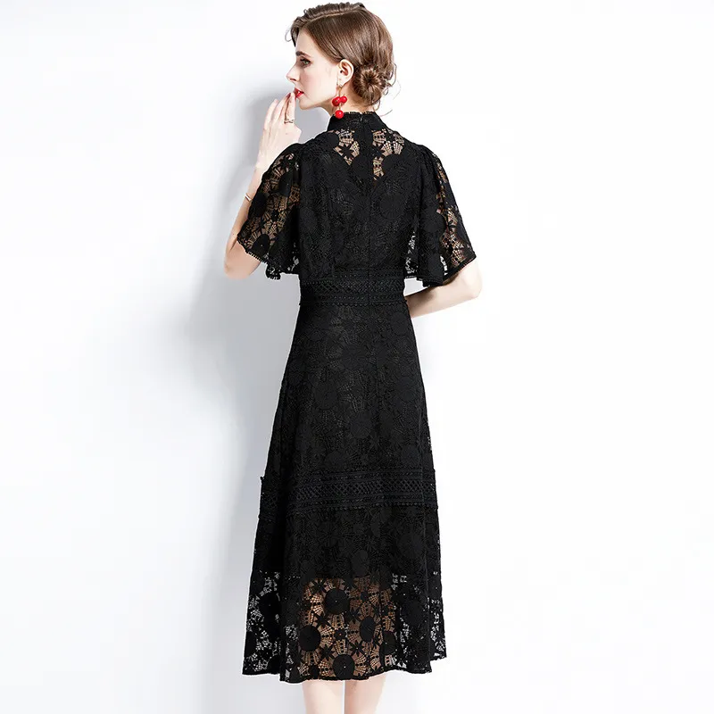 衣都精品- 2023新款黑色蕾絲立領短袖氣質連衣裙