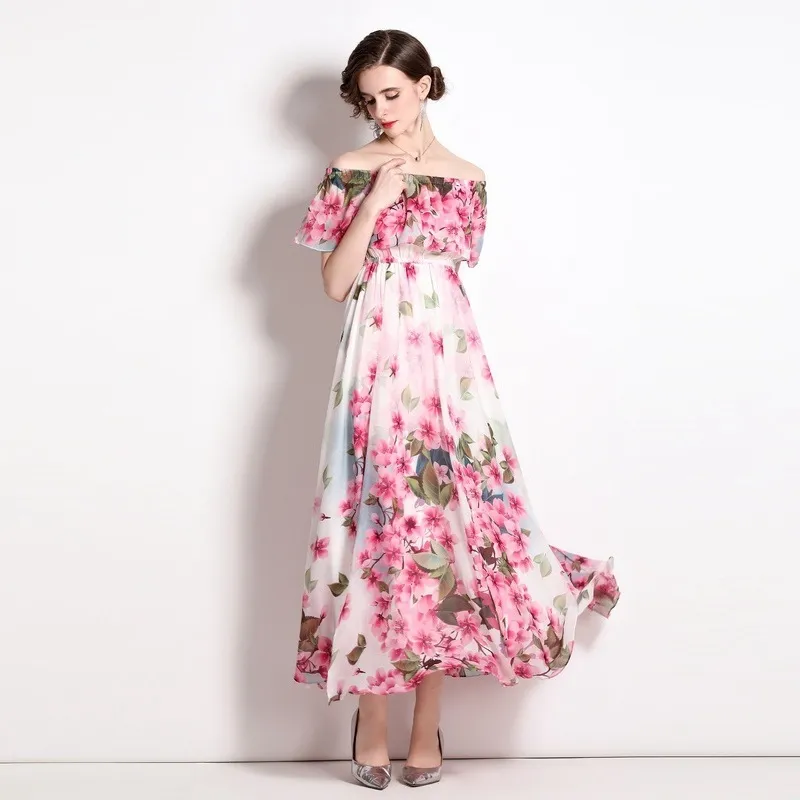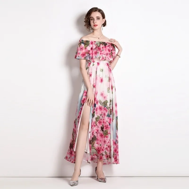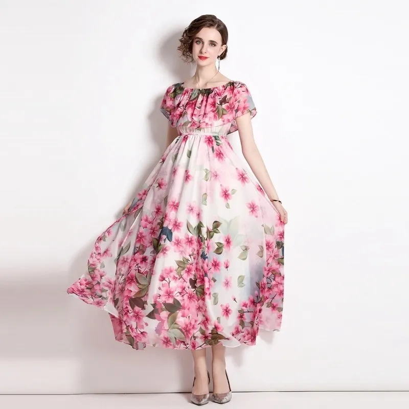 衣都精品- 2023新款夏季荷葉邊一字領收腰大擺連衣裙
