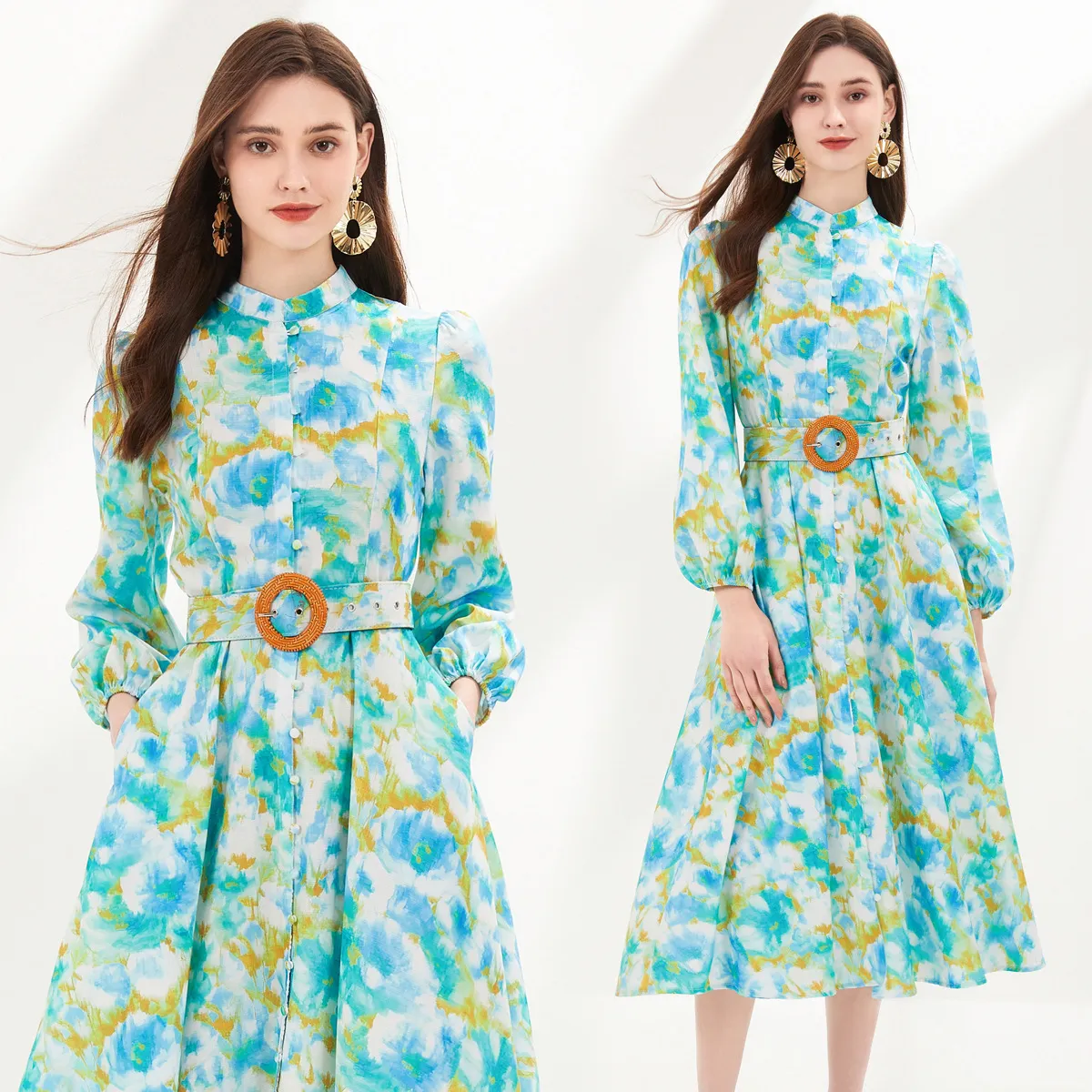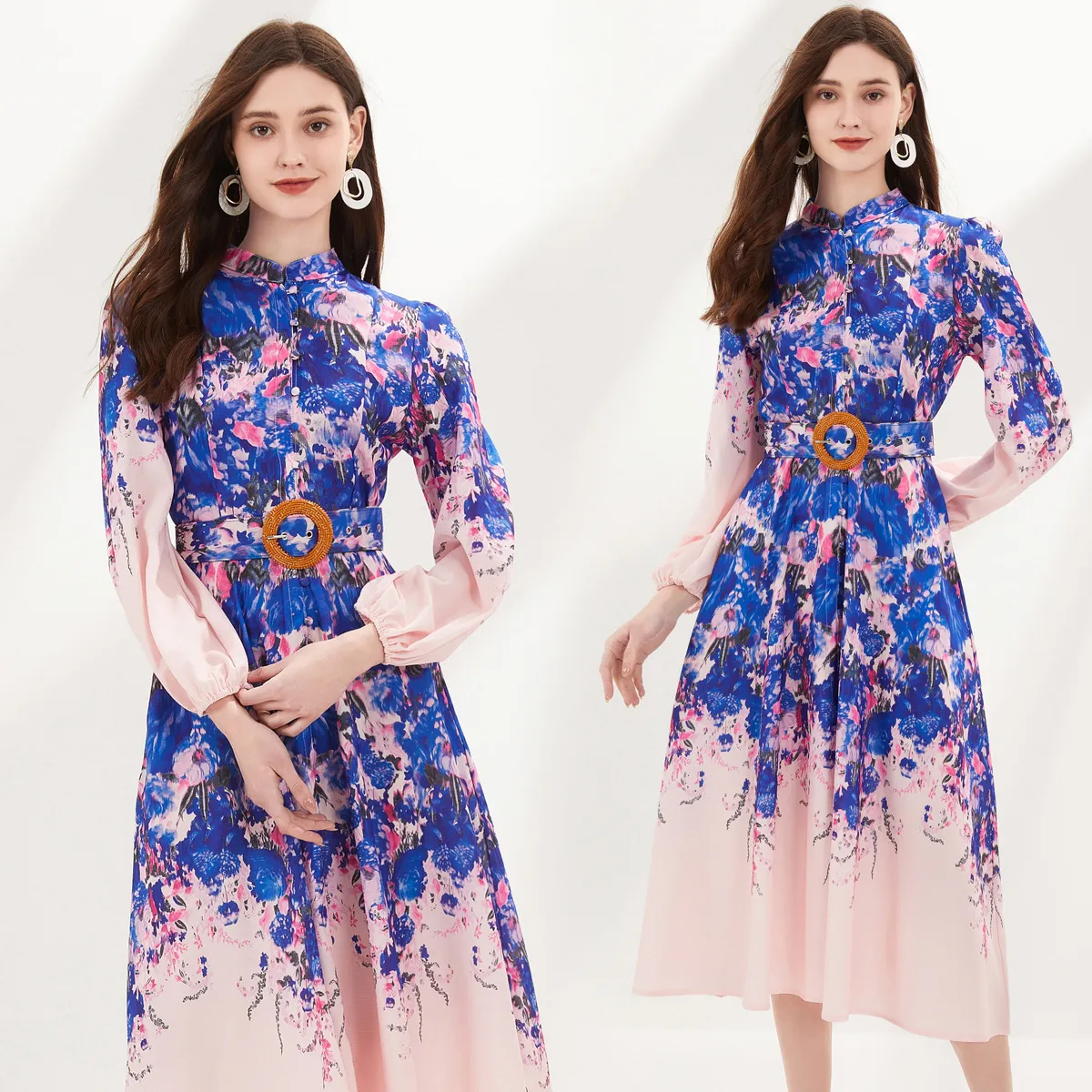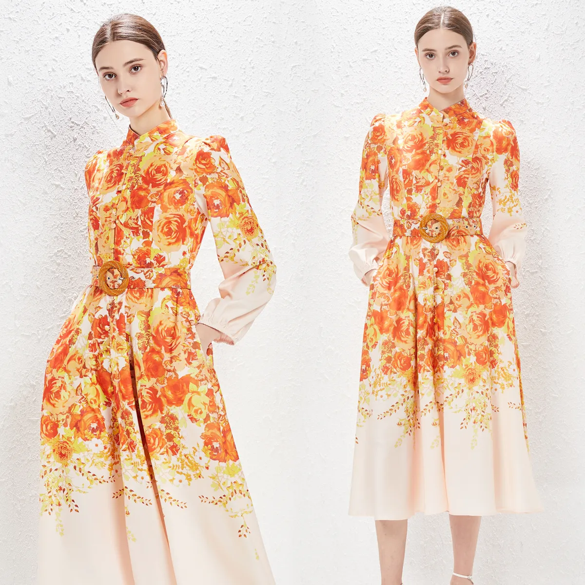衣都精品- 2023新款夏季時尚復古立領印花連衣裙