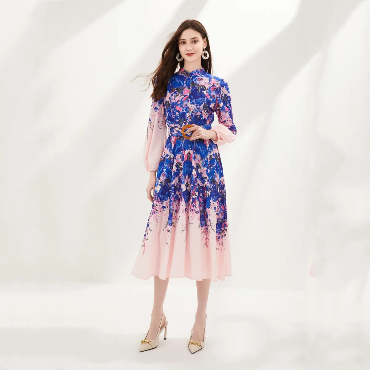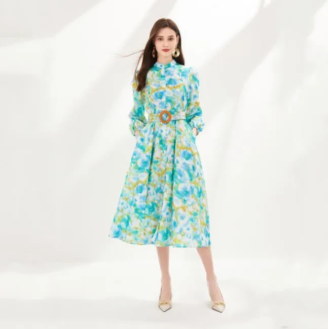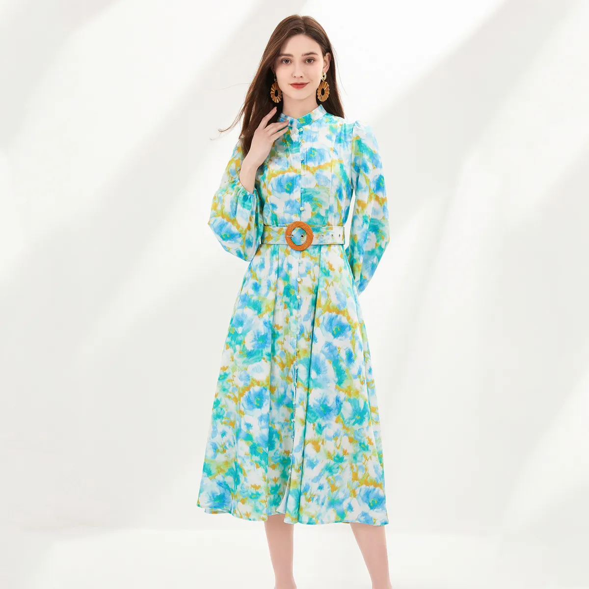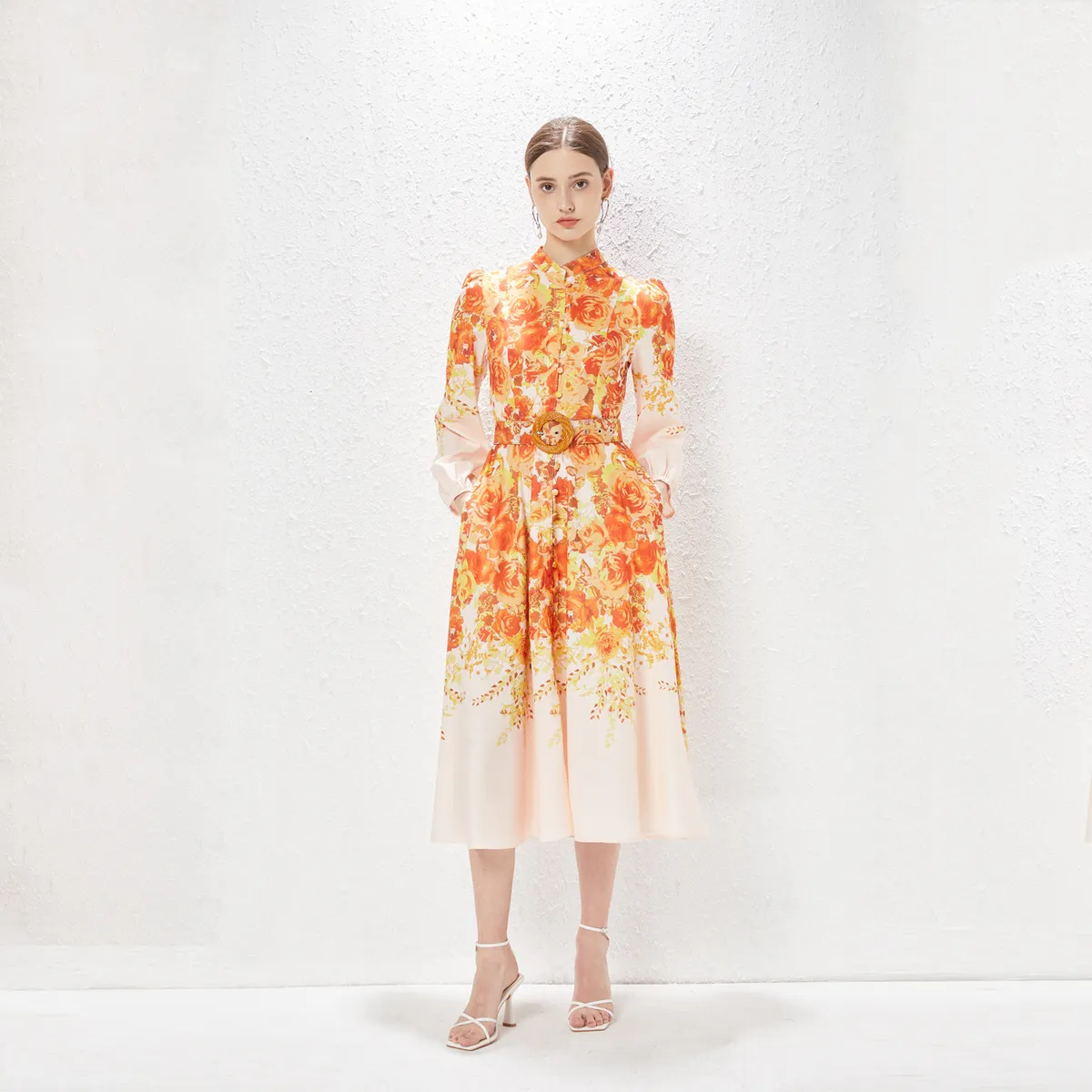 衣都精品- 2023新款夏季時尚復古立領印花連衣裙