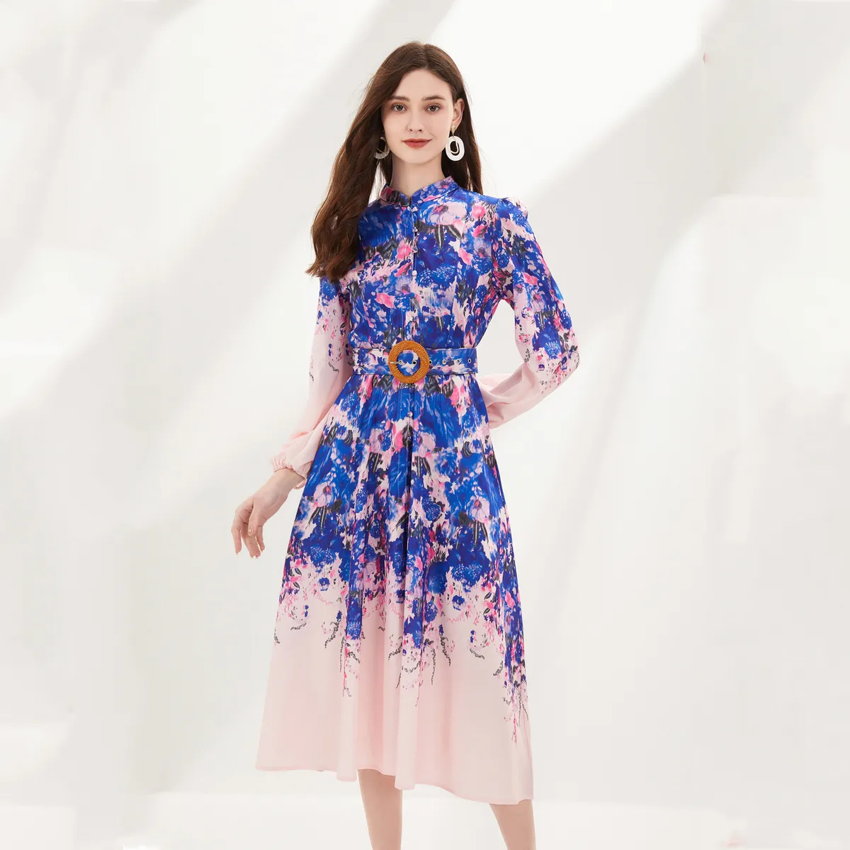 衣都精品- 2023新款氣質翻領長袖單排扣印花連衣裙