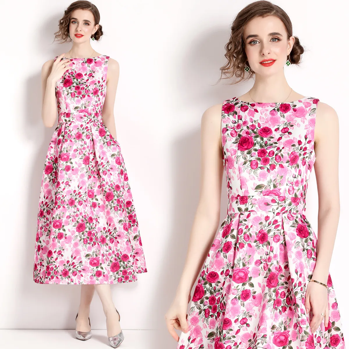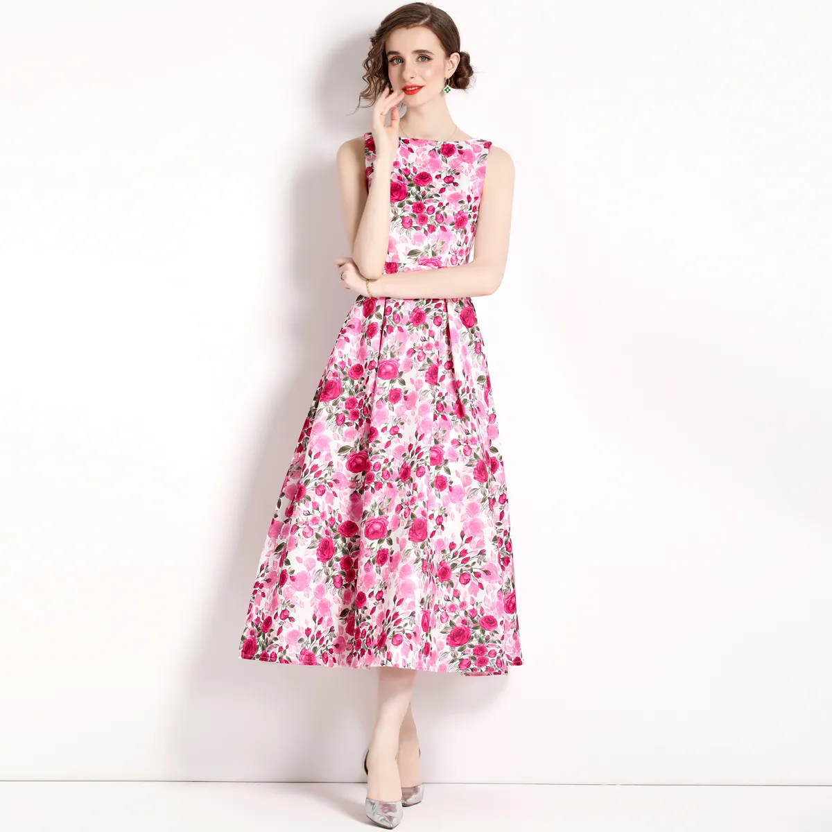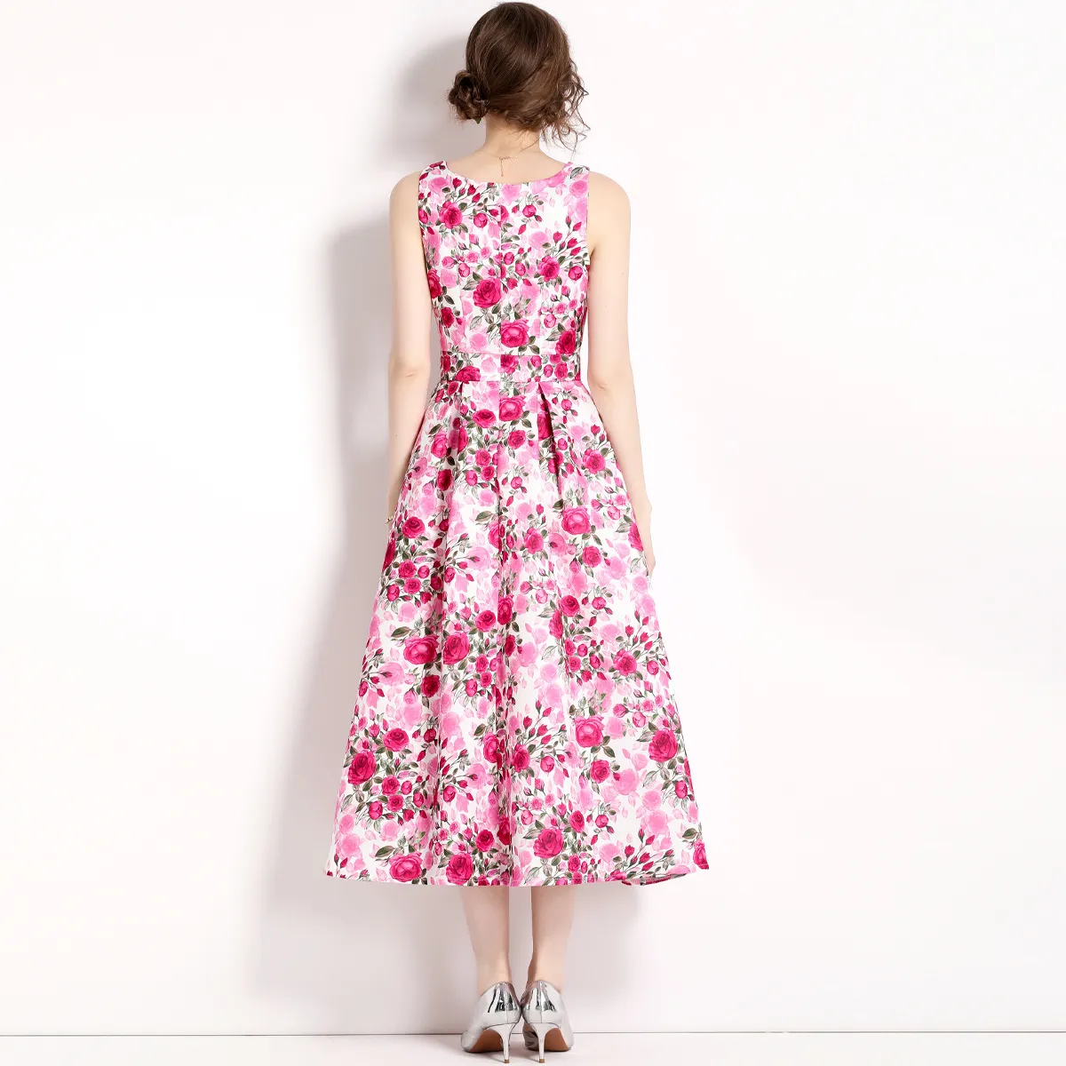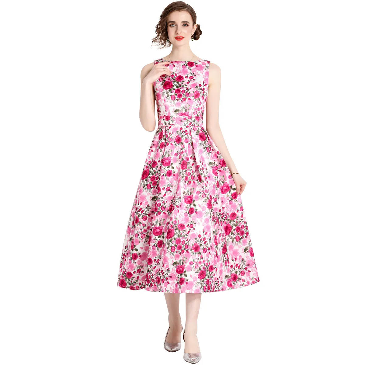 衣都精品- 2023新款夏季復古印花無袖高腰連衣裙