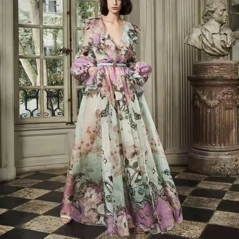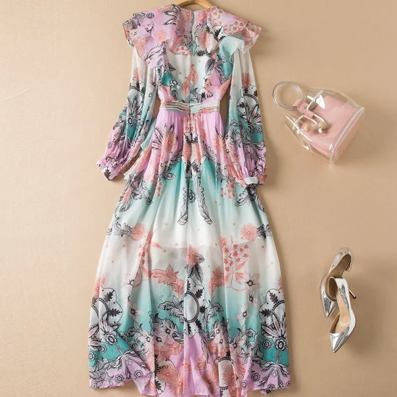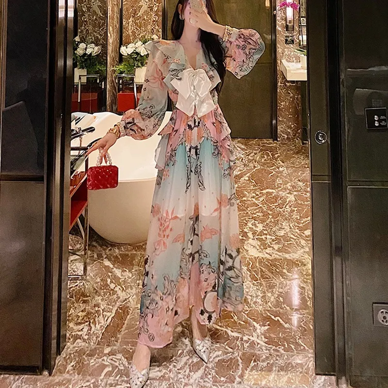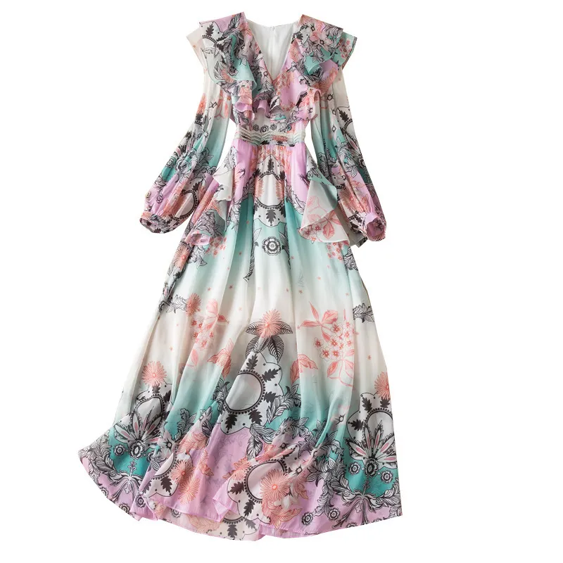 衣都精品- 2023新款歐美荷葉邊V領長袖復古連衣裙